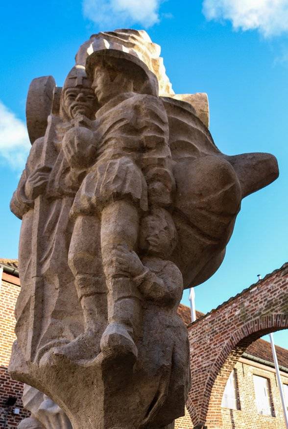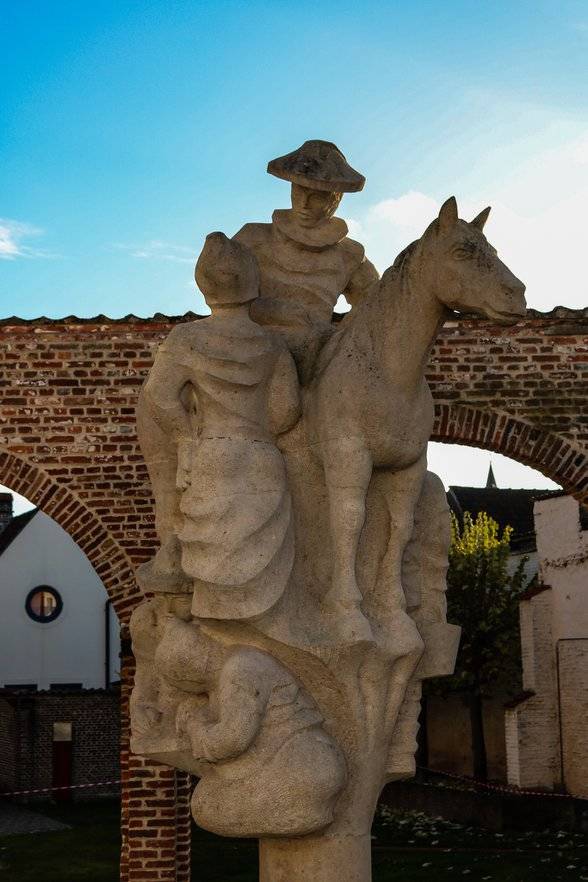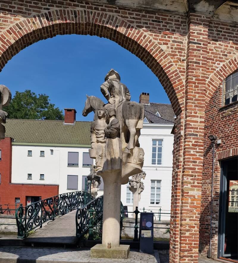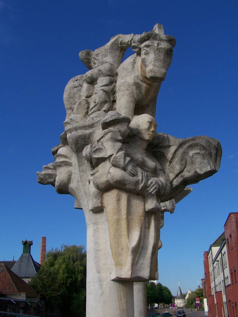 Kwade Beth, een jonge weduwe en herbergierster uit leper, is vermaard voor haar goede keuken, maar ook voor haar kwade tong. Als de keizer zwervend door Vlaanderen de herberg aandoet en aan de knecht de beste haver voor zijn paard vraagt, krijgt hij een flinke scheldpartij te horen. Zij scheldt hem uit voor arme jonker, kale pronker. De knecht Tone fluistert de keizer echter in het oor niet te luisteren naar de woorden van zijn bazin, daar ze steeds het tegenovergestelde bedoelt van wat ze zegt. Na enige aarzeling besluit de keizer toch te blijven en een maaltijd te nemen. Een voortreffelijk maal wordt op tafel gezet, maar de waardin blijft echter schelden op de bedienden, de klanten en vooral op Tone. Enkele dagen later komt keizer Karel aan dezelfde herberg voorbij met zijn gevolg. De stomverbaasde waardin herkent in de keizer de jonge pronker van enkele dagen voordien. Totaal uit haar lood geslagen en het ergste vrezend, smeekt de vrouw kermend om vergiffenis voor haar boze woorden. In plaats van haar te straffen, verplicht de keizer haar te huwen met haar knecht. Toen bleek dat Tone, de brave knecht gelijk had over de woorden die hij de keizer in het oor had gefluisterd: ze schold haar knecht uit omdat ze niet onder woorden had kunnen brengen dat ze van hem hield.Keizer Karel is hier als ruiter voorgesteld. Kwade Beth en haar knecht staan aan zijn linkerzijde.