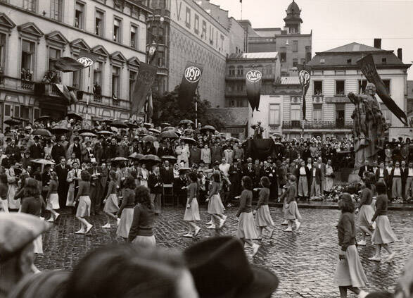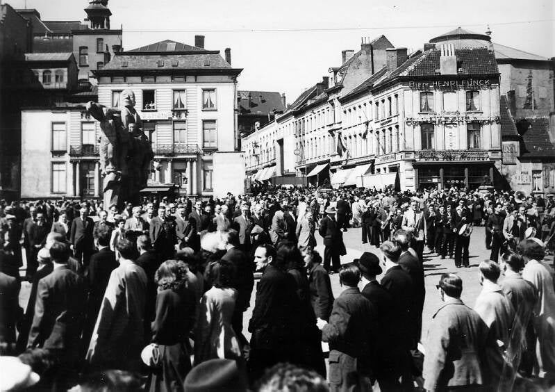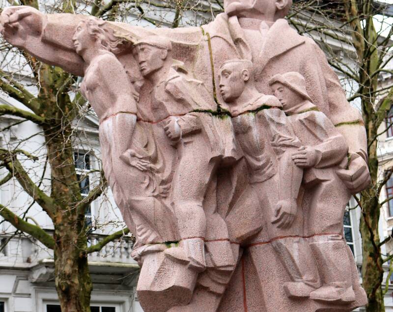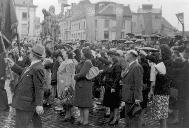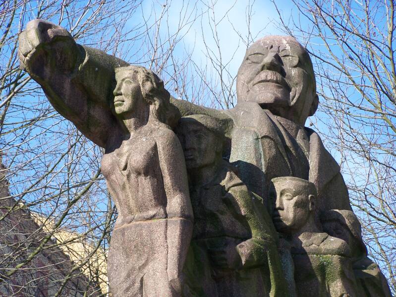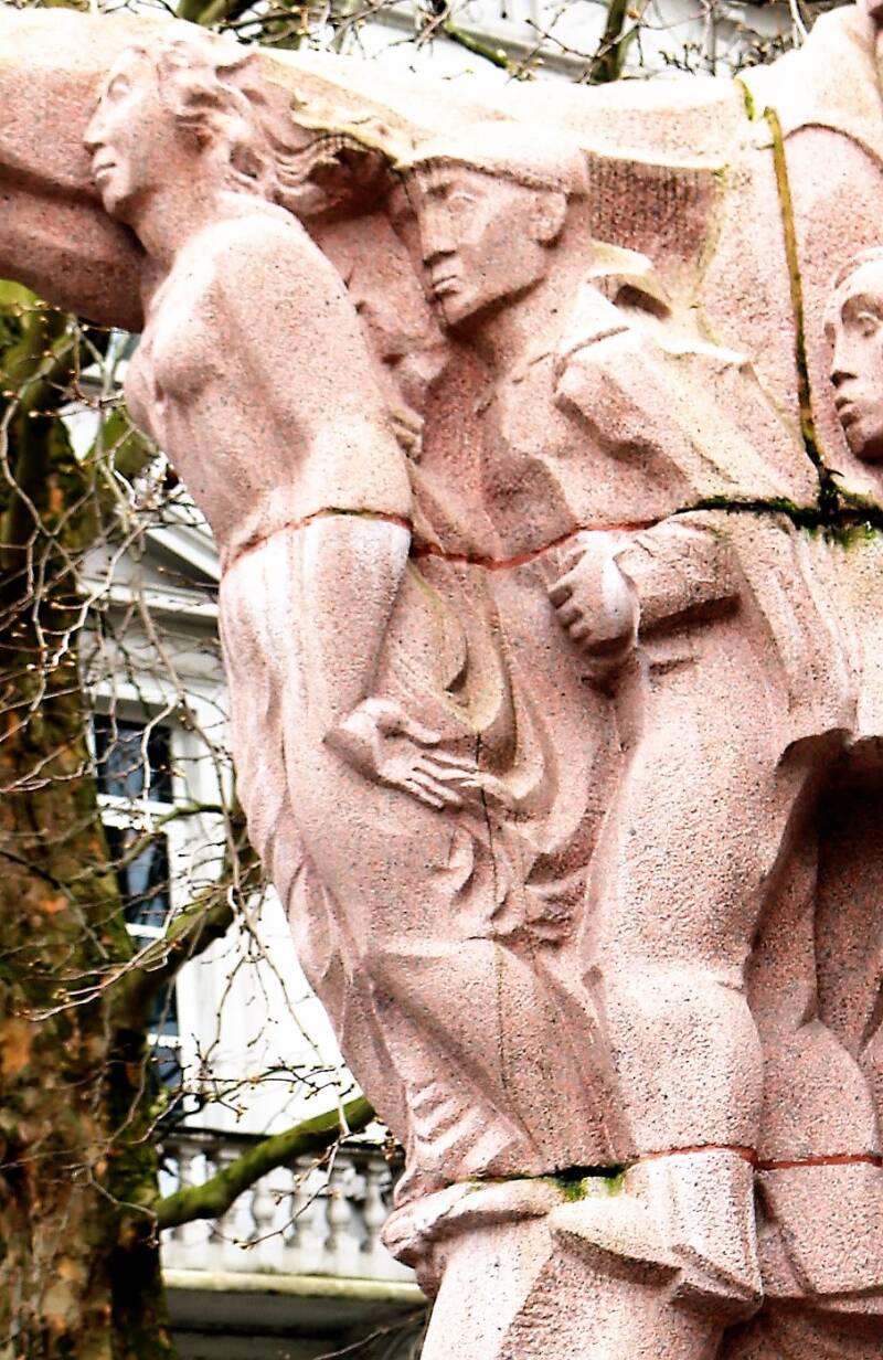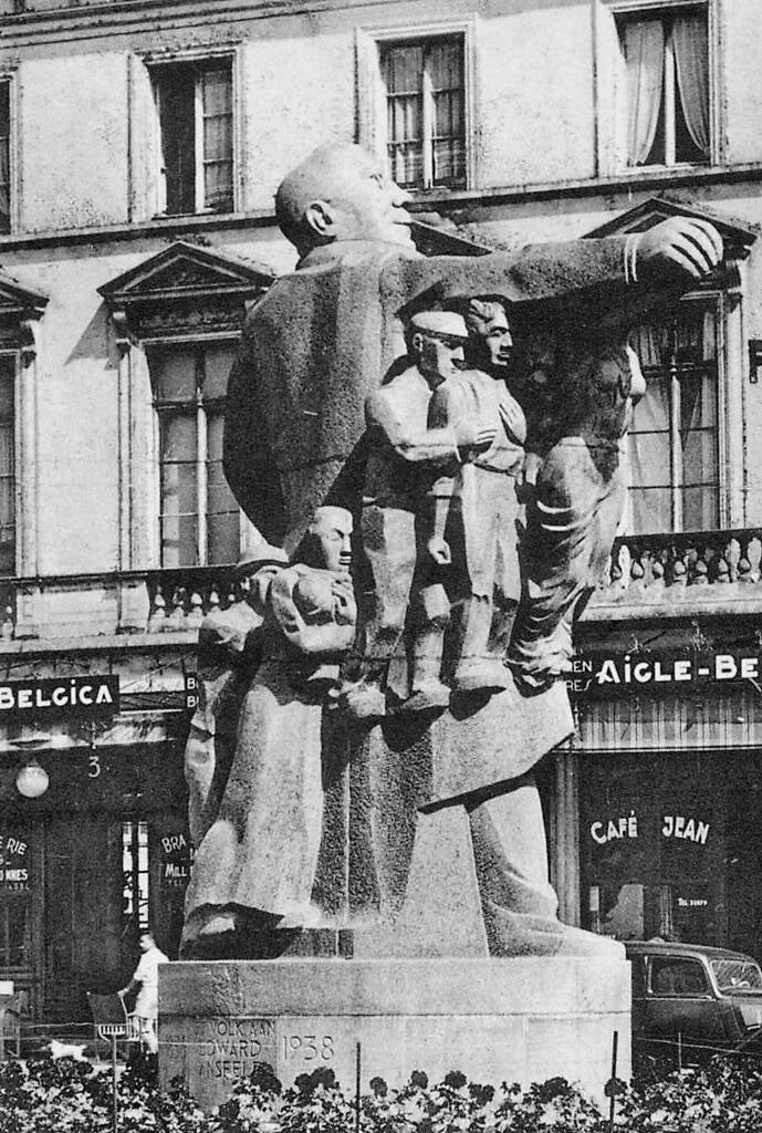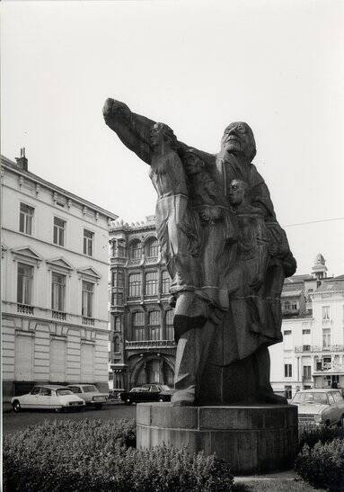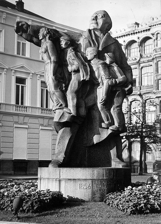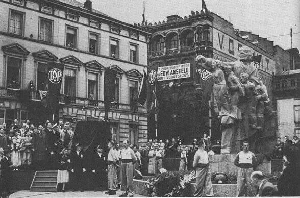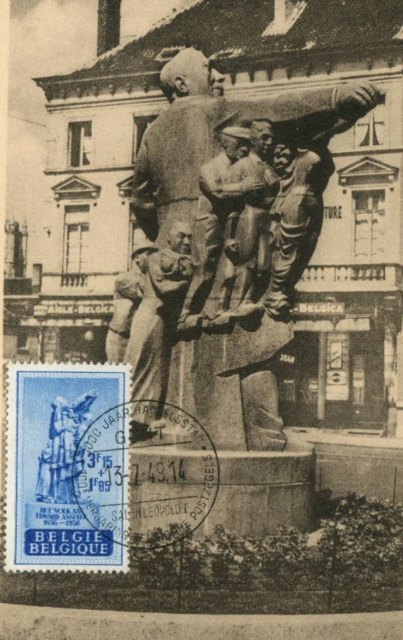 De figuren stellen het volk voor, die de weg volgen die E. Anseele aanwijst.