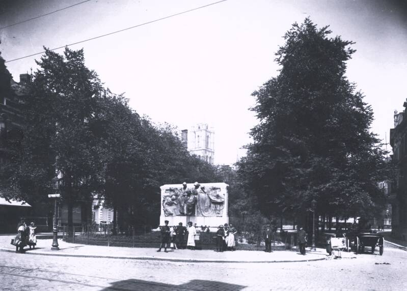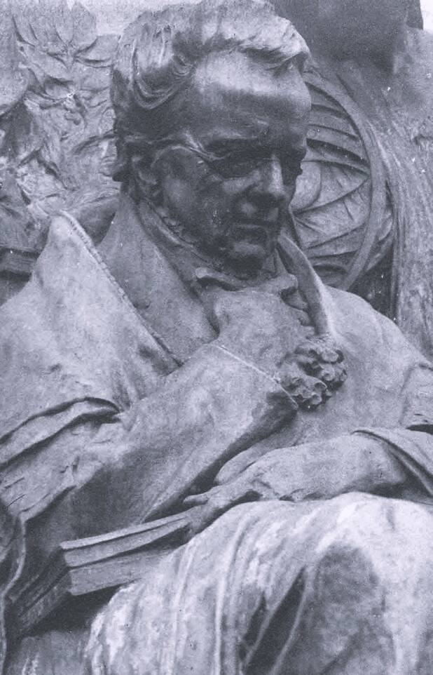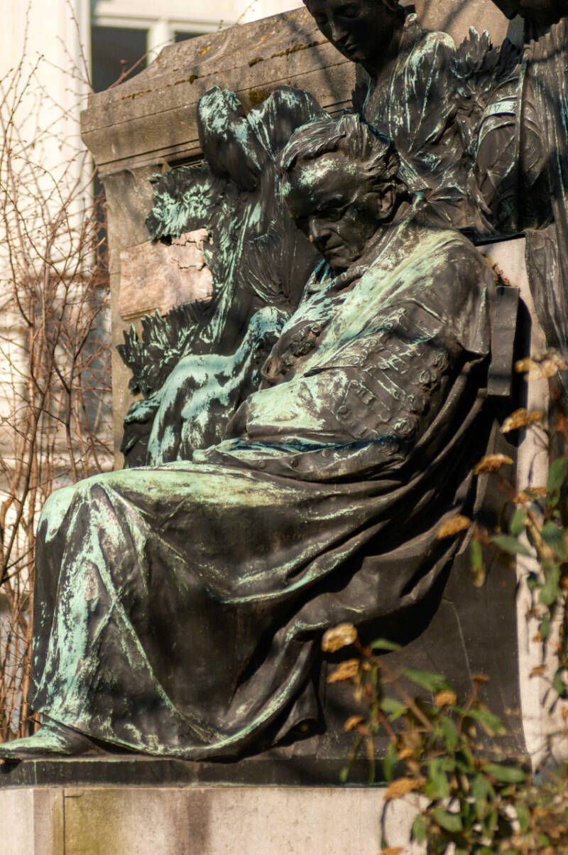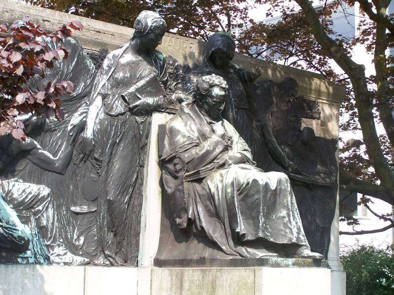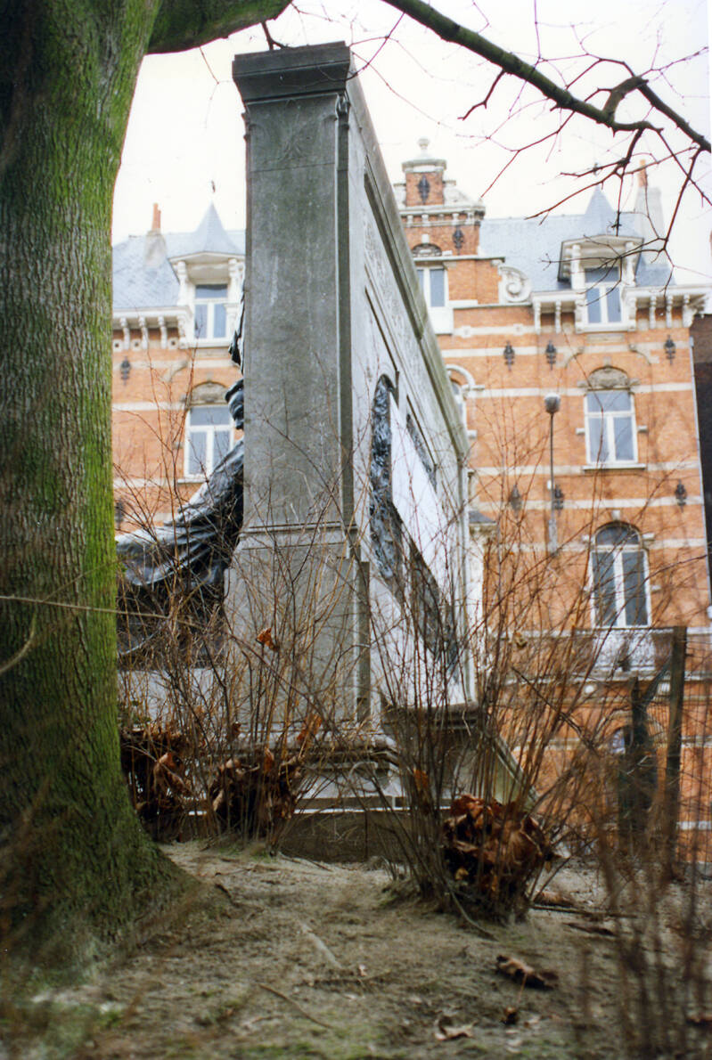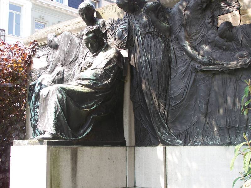 Bronzen standbeeld op arduinen sokkel, aanvankelijk toevertrouwd aan Julien Dillens, maar hij overleed vooraleer het werk af was.