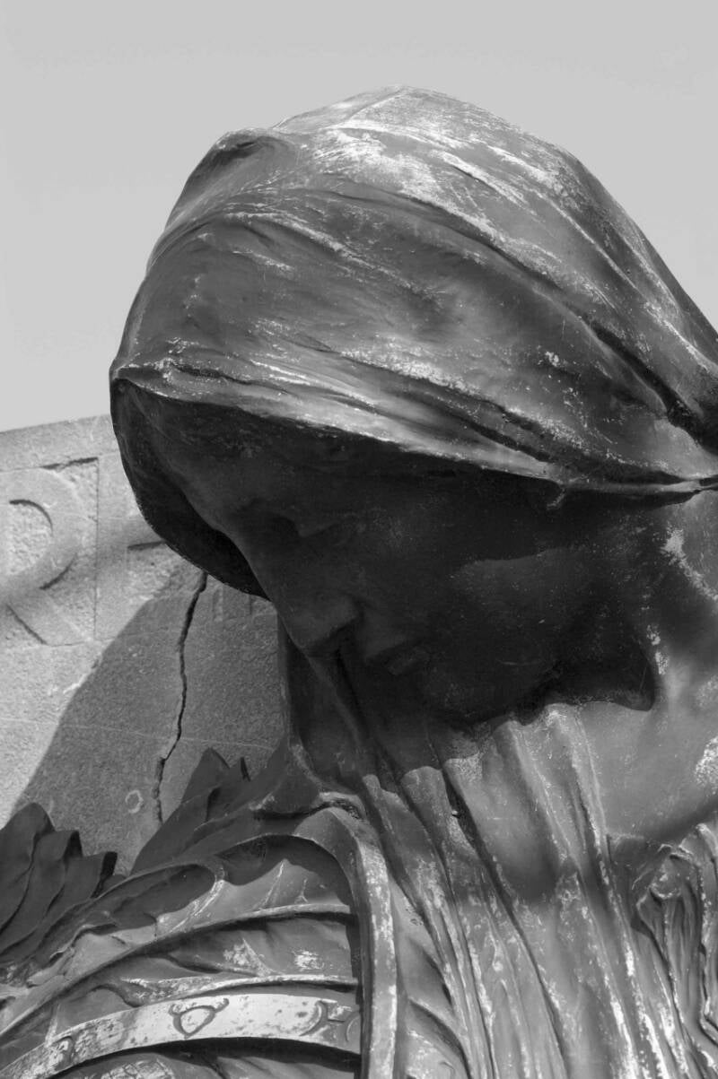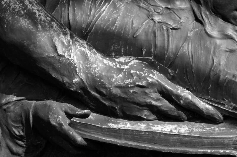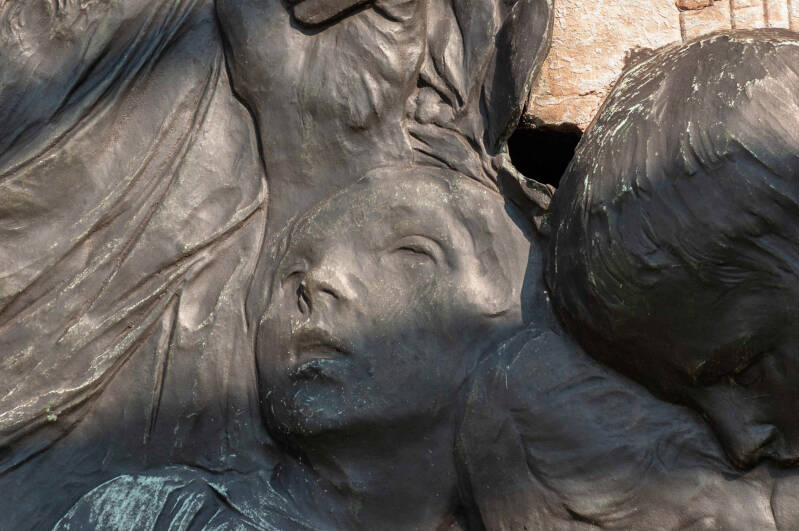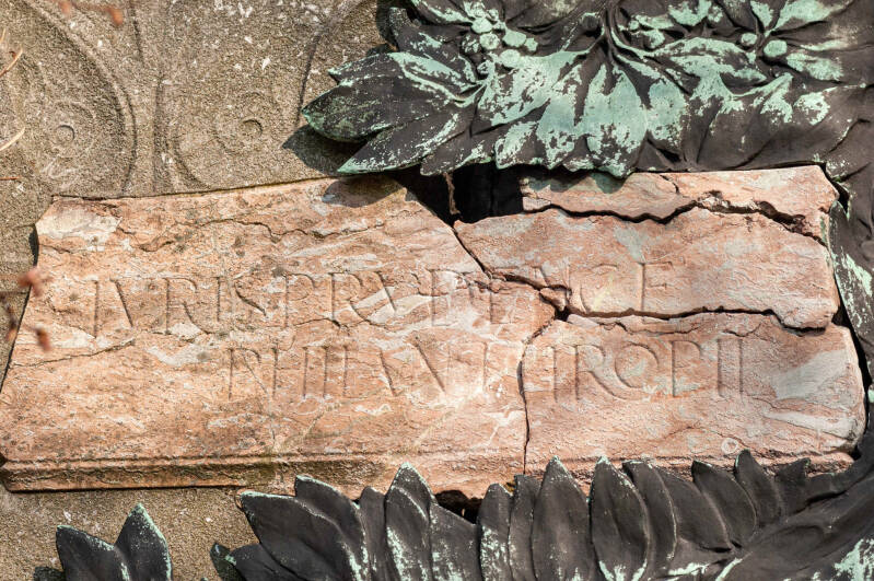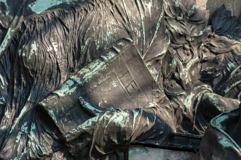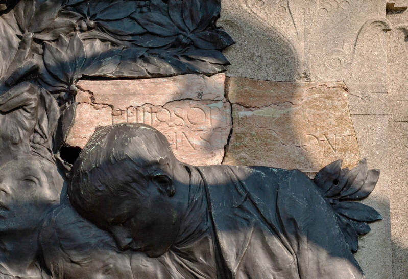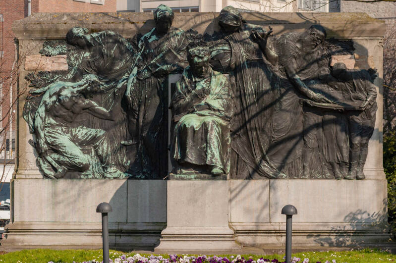 Hij wordt omringd door 4 allegorische figuren (abstract) die in bas-reliëf zijn uitgewerkt: