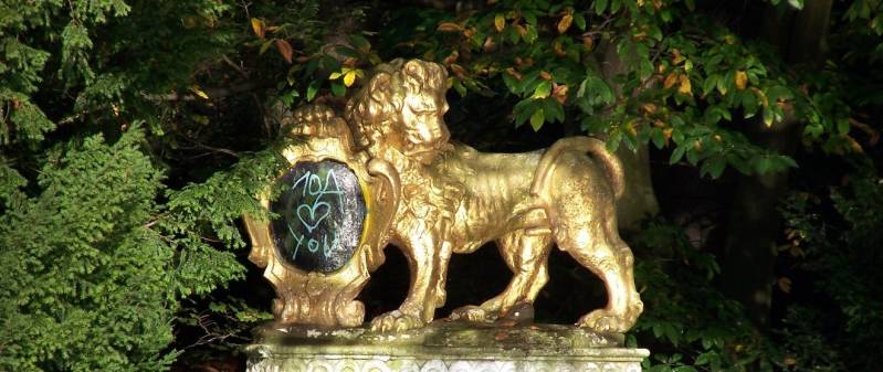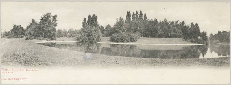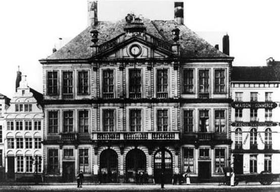 Het leeuwenbeeld dat de gevel van het Pakhuis op de Korenmarkt bekroonde, was een werk van beeldhouwer Jakob van der Cruijscen uit 1722. Na de afbraak van het Pakhuis in 1897 verhuisde het beeld naar het Citadelpark, waar het nu nog steeds over de grote vijver uitkijkt. Met zijn rechtervoorpoot houdt hij het wapenschild van Gent. Tekening van Armand Heins in: Inventaire Archeologique de Gand, 1898 [Archief Gent]