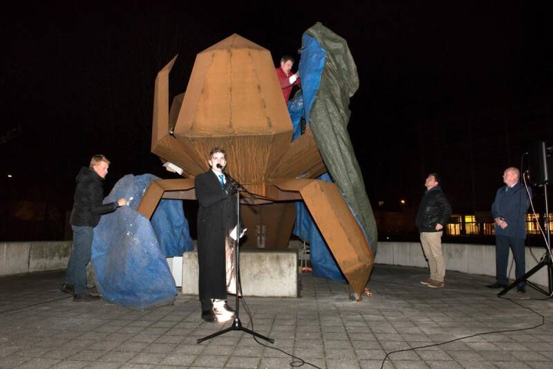 Even later verplaatst een kraan het werk naar zijn bestemming en sindsdien wekt het de nieuwsgierigheid van passanten. Laatste laswerken en bedrijvigheid ter plaatse doen daar nog een schepje bovenop.
