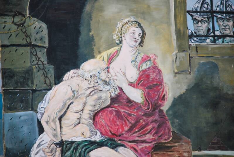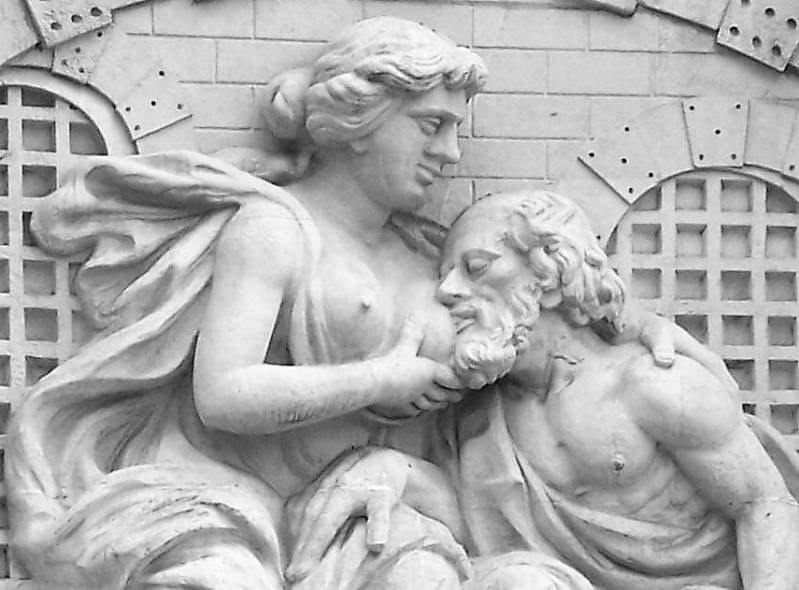 “Cimon zit in de gevangenis, vastgeketend aan zijn voet, en is gedoemd de hongerdood te sterven. Zijn dochter Pero komt hem bezoeken en laat hem aan haar borst drinken. Ze draagt een kind op de arm. Dankzij de melk van zijn dochter vindt de oude man opnieuw levenskracht. De stadsmagistraat, die het verhaal te horen krijgt, besluit Cimon vrij te laten, en hij mag op staatskosten leven zodat hij nooit meer honger hoeft te lijden. Deze legende was erg populair in het Oude Rome. Al gauw wordt Pero het symbool van de liefdevolle toewijding van een kind ten opzichte van zijn ouder. Het thema krijgt de naam 'Caritas Romana’.