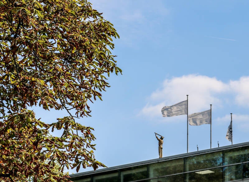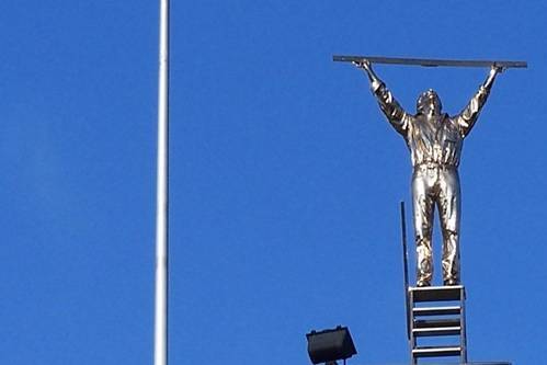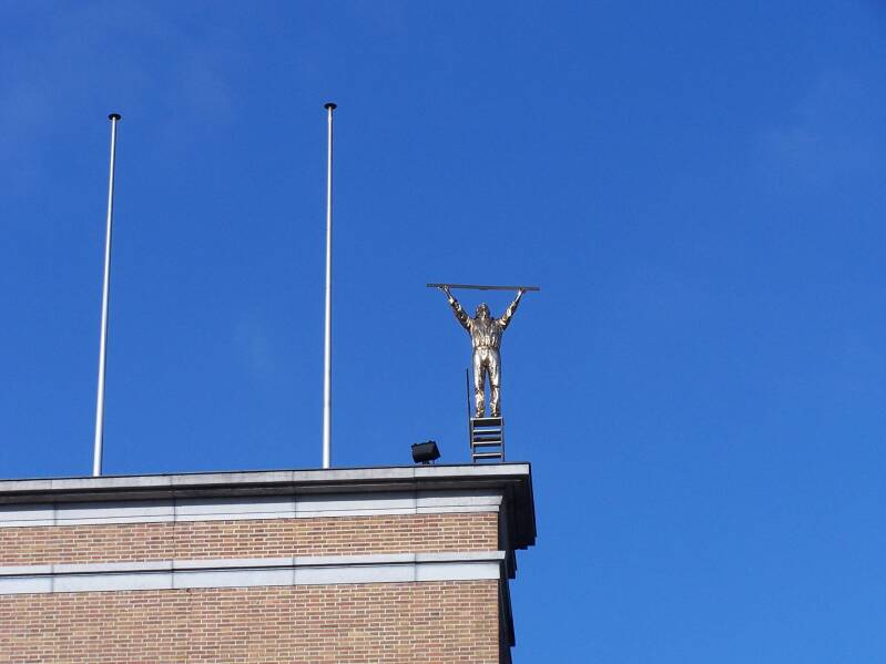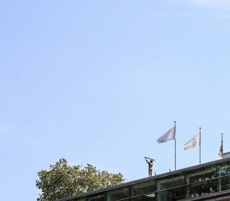 De man die de wolken meet, is bijna vier meter hoog, weegt 450 kilo en glanst als een spiegel. Het werk stelt Jan Fabre zelf voor, die met een meetlat op een laddertje staat, druk doende de wolken te meten.