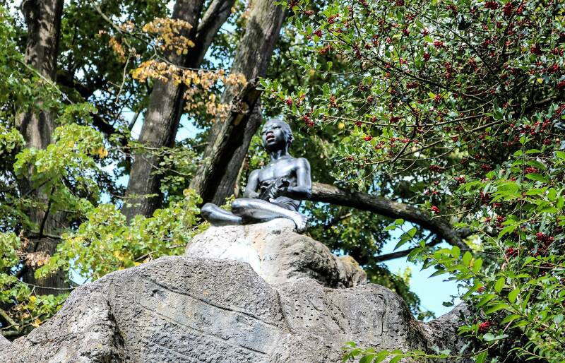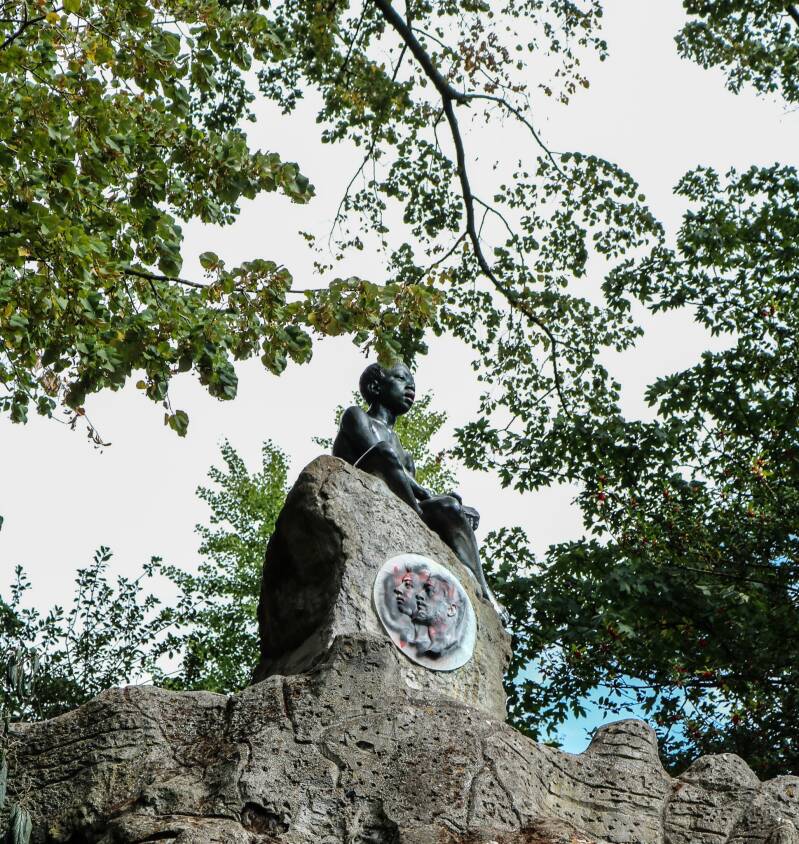 Het Citadelpark staat vol met kunstmatige rotsen, maar op één ervan, aan de vijver met de vergane zonnebloemen, zit een zwart manneke.