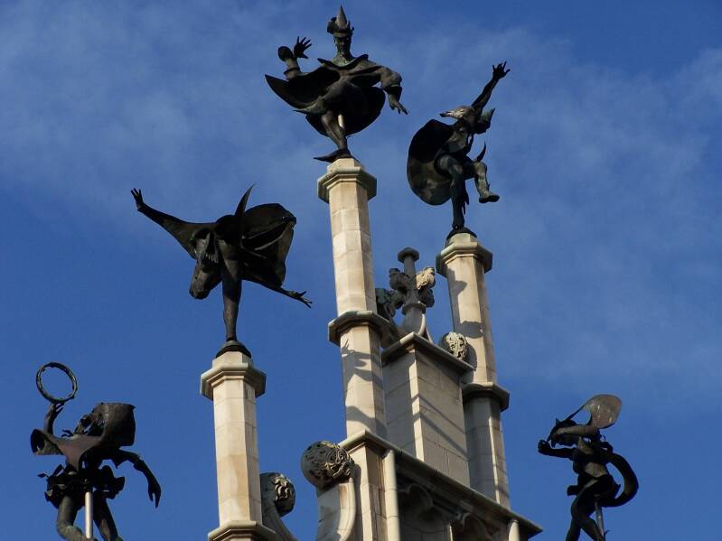 De Morisken, beeldhouwwerken van Walter De Buck (1992), op de hogels van het metselaarshuis.