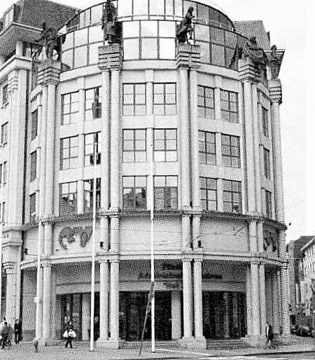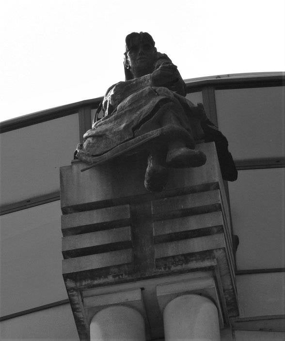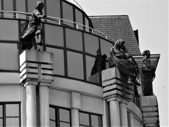Beeldengroep staat boven Provinciaal gebouw winston Woodrowplein. Bij de hoek van de Oudescheldestraat en de Vlaanderenstraat is het rechter gedeelte van het Urbis-complex de Economische Raad voor Oost-Vlaanderen. De bronzen beelden hoog boven de entree zijn gemaakt door Bernard Vandenberghe. Beetje mysterieus maar trots hoog boven het Woodrow Wilsonplein.