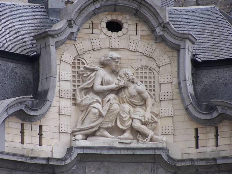 “Cimon zit in de gevangenis, vastgeketend aan zijn voet, en is gedoemd de hongerdood te sterven. Zijn dochter Pero komt hem bezoeken en laat hem aan haar borst drinken. Ze draagt een kind op de arm. Dankzij de melk van zijn dochter vindt de oude man opnieuw levenskracht. De stadsmagistraat, die het verhaal te horen krijgt, besluit Cimon vrij te laten, en hij mag op staatskosten leven zodat hij nooit meer honger hoeft te lijden. Deze legende was erg populair in het Oude Rome. Al gauw wordt Pero het symbool van de liefdevolle toewijding van een kind ten opzichte van zijn ouder. Het thema krijgt de naam 'Caritas Romana’.