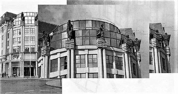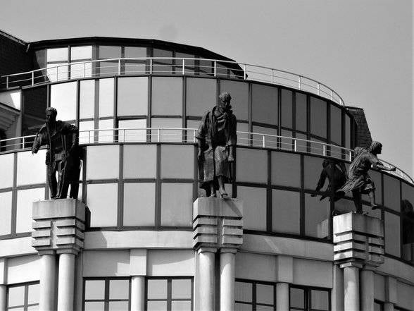 Beeldengroep staat boven Provinciaal gebouw winston Woodrowplein. Bij de hoek van de Oudescheldestraat en de Vlaanderenstraat is het rechter gedeelte van het Urbis-complex de Economische Raad voor Oost-Vlaanderen. De bronzen beelden hoog boven de entree zijn gemaakt door Bernard Vandenberghe. Beetje mysterieus maar trots hoog boven het Woodrow Wilsonplein.