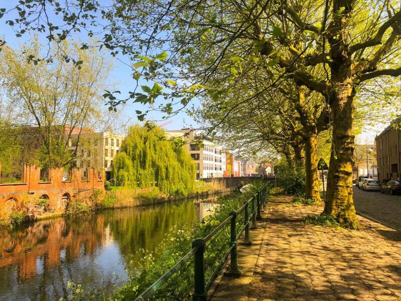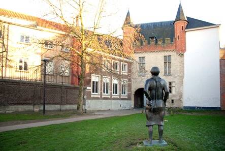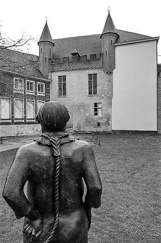 In 1540 strafte Keizer Karel de Gentenaars omdat ze weigerden belastingen te betalen. Ze moesten blootsvoets en met een strop om de hals knielen voor de keizer. Deze man knielt niet nederig, maar draagt de strop met fierheid. De Stroppendrager symboliseert het koppige karakter van de Gentenaars. Het knipoogje naar de geschiedenis is duidelijk. Het beeld houdt één arm achter de rug. Als teken van verachting houdt hij de duim tussen wijs- en middelvinger. Het beeld is een ontwerp van de Gentse kunstenaar Chris De Mangel en is omgeven door een heuvelig grasveldje. Het is afgebakend door een gebouw met industriële toren. Dit alles doet terugdenken aan het rijke industriële verleden. Het gebouw doet niet langer dienst binnen de textielindustrie, maar u ziet restanten van mooi bewaard gebleven industriële archeologie.