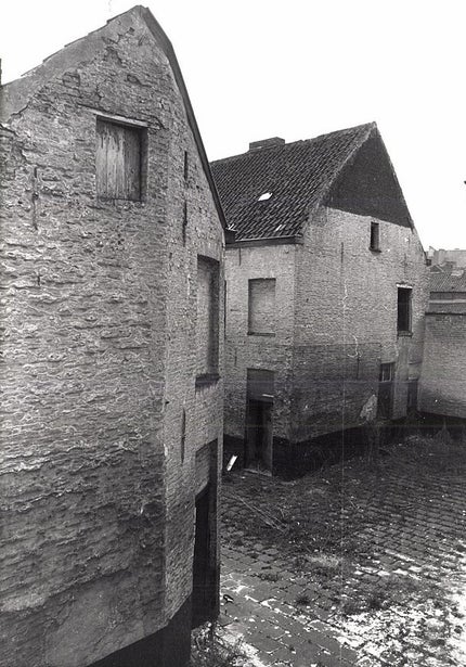 De huisjes aan het armoedige Benedictijnenstraatje zijn na onbewoonbaarverklaring afgebroken, eerst de rechtse die letterlijk tegen de industrie aanleunden, pas jaren nadien ook die aan de overkant.