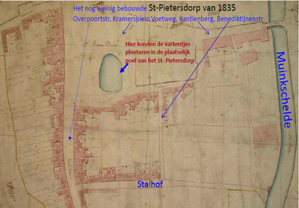 De bedoelde proletarische wijk (ook aansluitend met stegen en koertjes aan de Heuvelstraat- nu Overpoortstraat, en zelfs verder met cité's als Hoveniersberg, op de Schelde-oever en Batavia aan Rozier/Blandijnberg) lag op het grondgebied van het vroegere St-Pietersdorp en zelfs grotendeels op dit van de abdij; als dusdanig bevond hij zich binnen de stadsmuren (wat men bvb. ook kan afleiden uit de ligging van het "peperbus"- wachttorentje aan de Hertogin Isabellakaai, en overgebleven gedeelten der oude stadsomheining die nu nog de achtermuur vormen van de tuinen der huizen met onpare nummers aan de Citadellaan).
