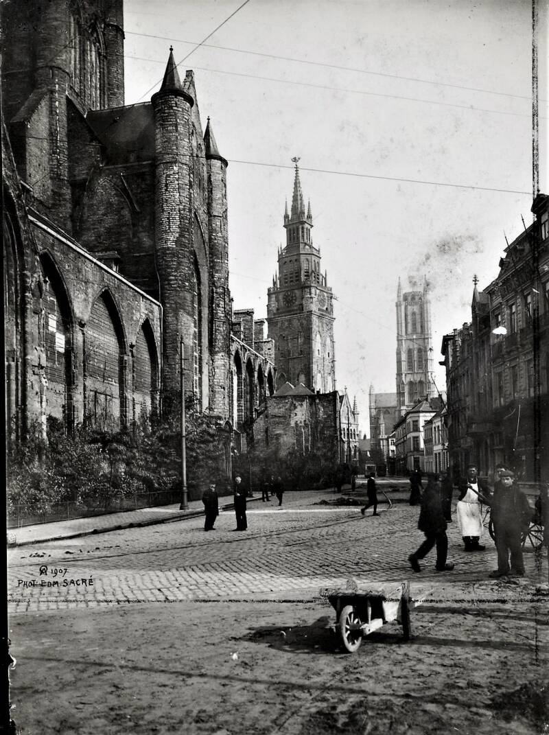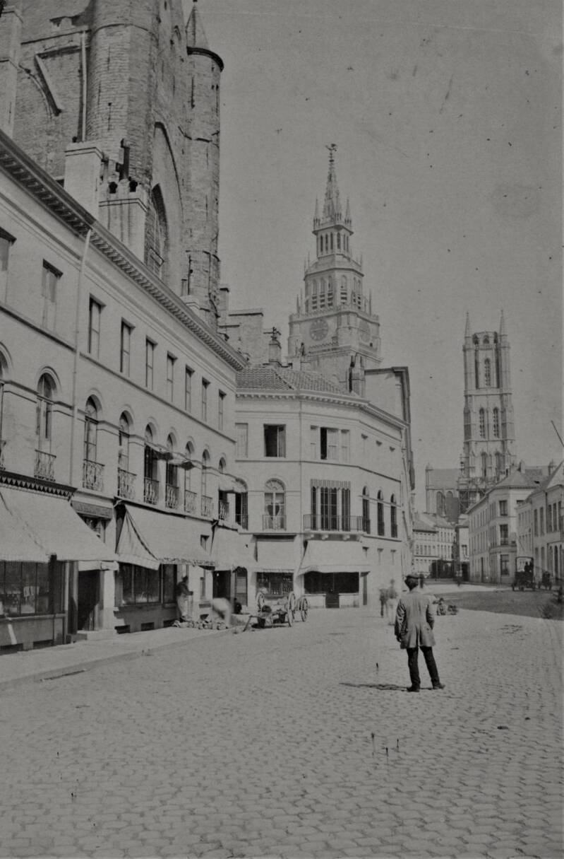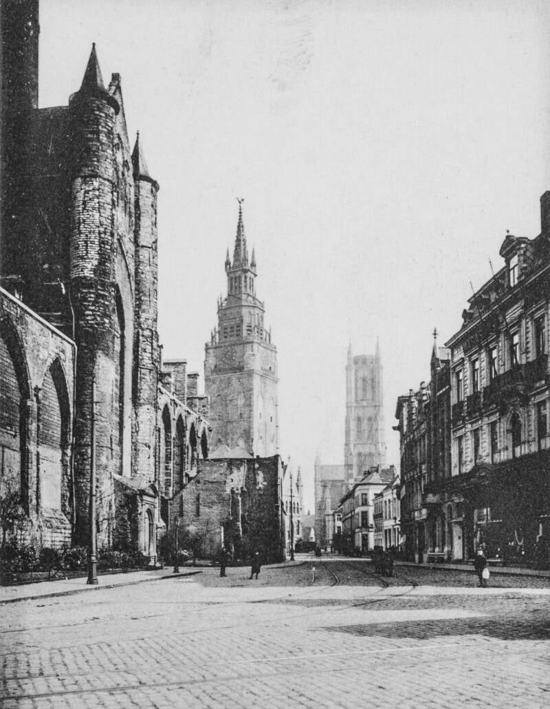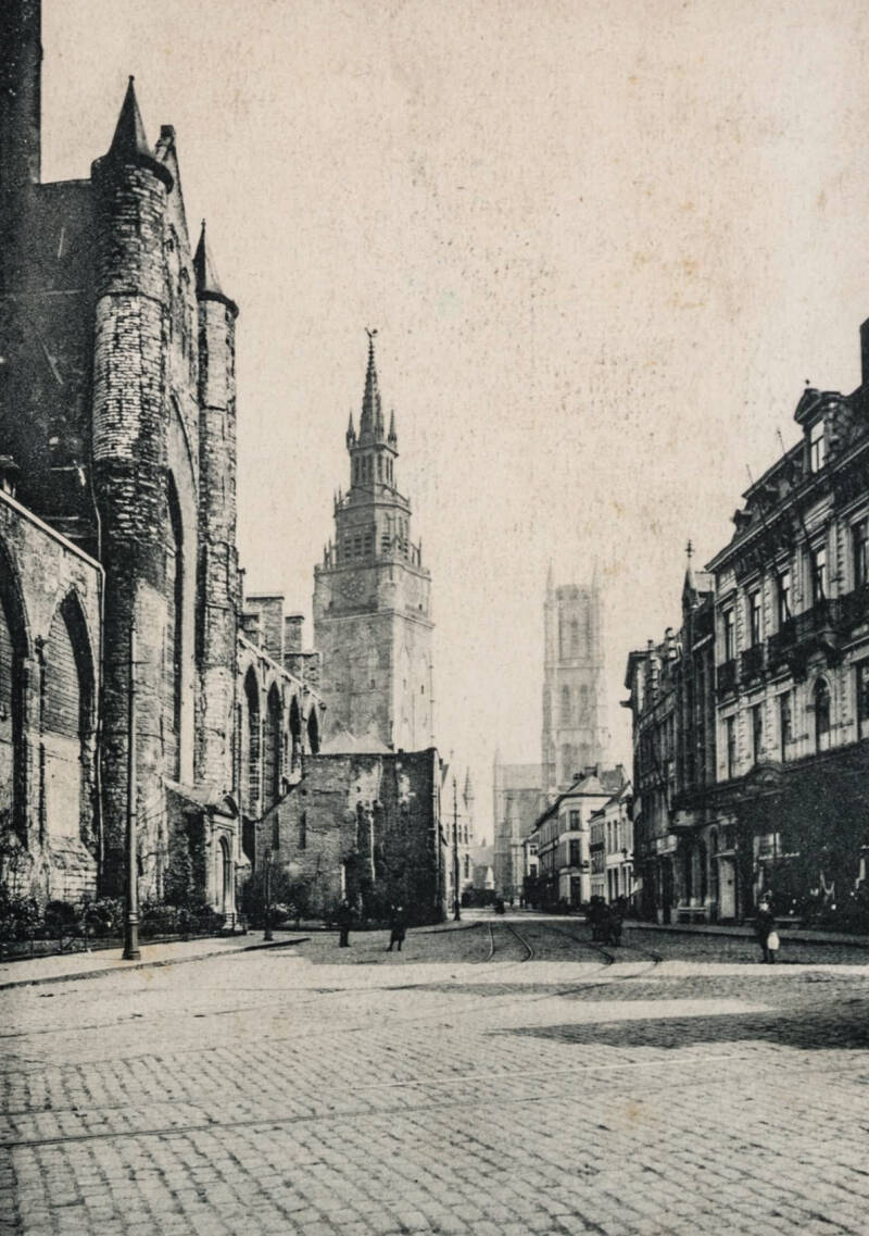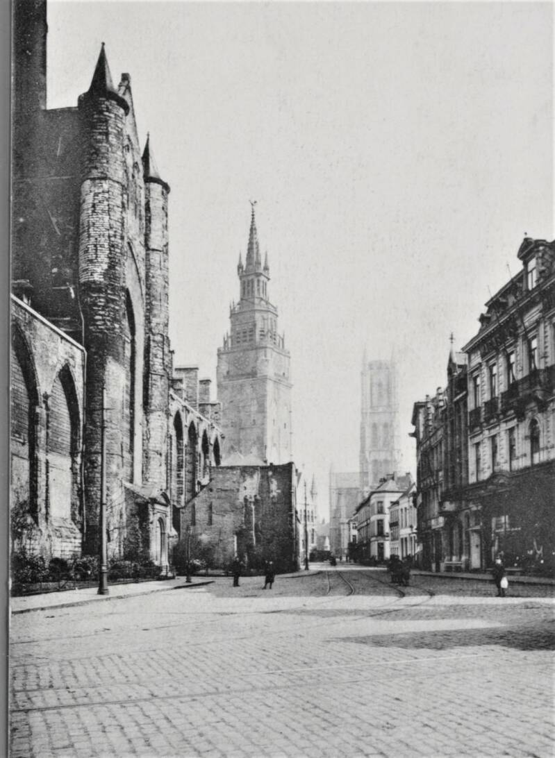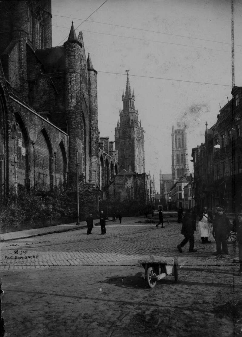 Tussen 1900 en 1913 werd met het oog op de wereldtentoonstelling de ruimte tussen het Belfort en de St.-Niklaaskerk gevrijwaard van woningen. Mede met de steun van de op 11 maart 1893 opgerichte “Maatschappij voor Geschied- en Oudheidkunde te Gent” zal het Braun-Van Asscheplan daterend mei 1896 in 1901 worden uitgevoerd. Bij deze ontmanteling zijn in een eerste fase de woningen gesloopt grenzend aan de St.-Niklaaskerk op de Korenmarkt en in de Cataloniëstraat tot net voorbij de zijingang. Verder bleven de woningen nog een tijdje staan waaronder een herberg die toepasselijk de naam droeg “Voor zoo lang als ’t duurt”.