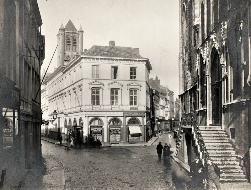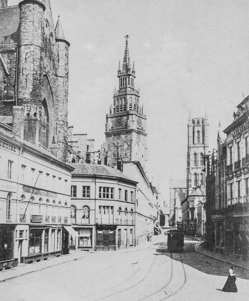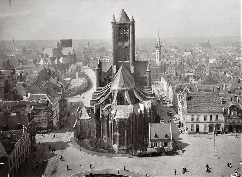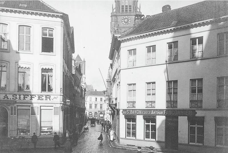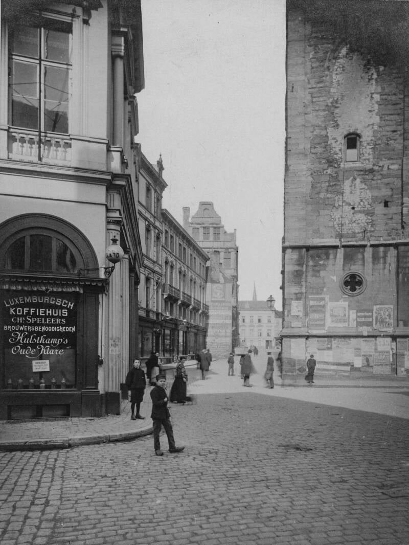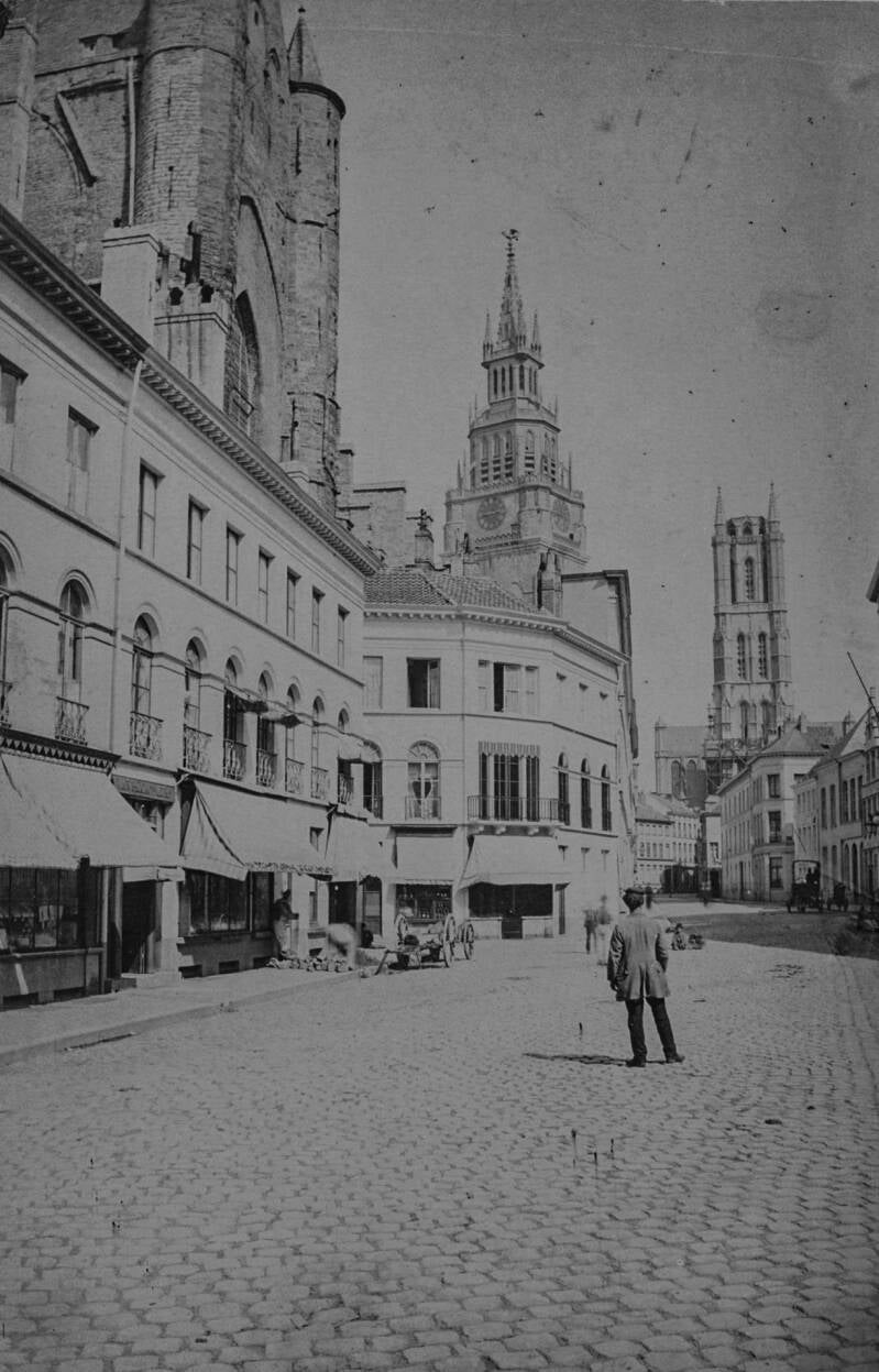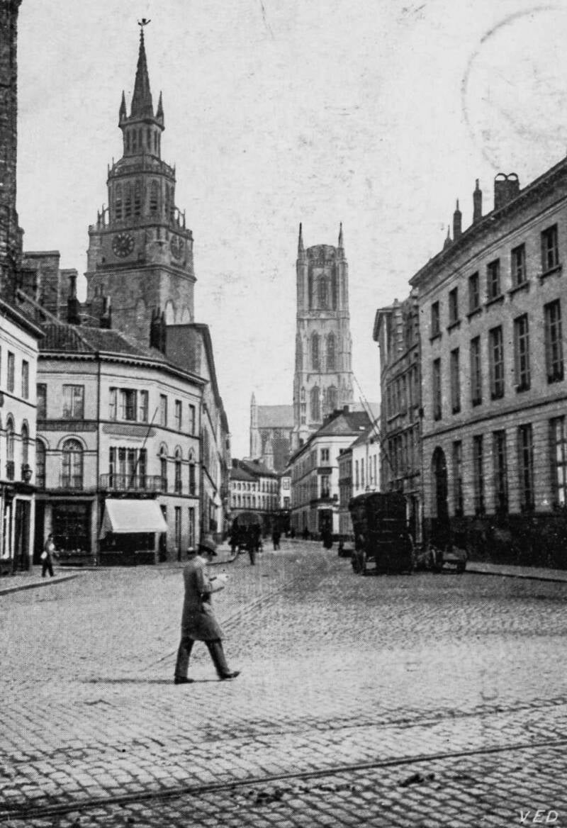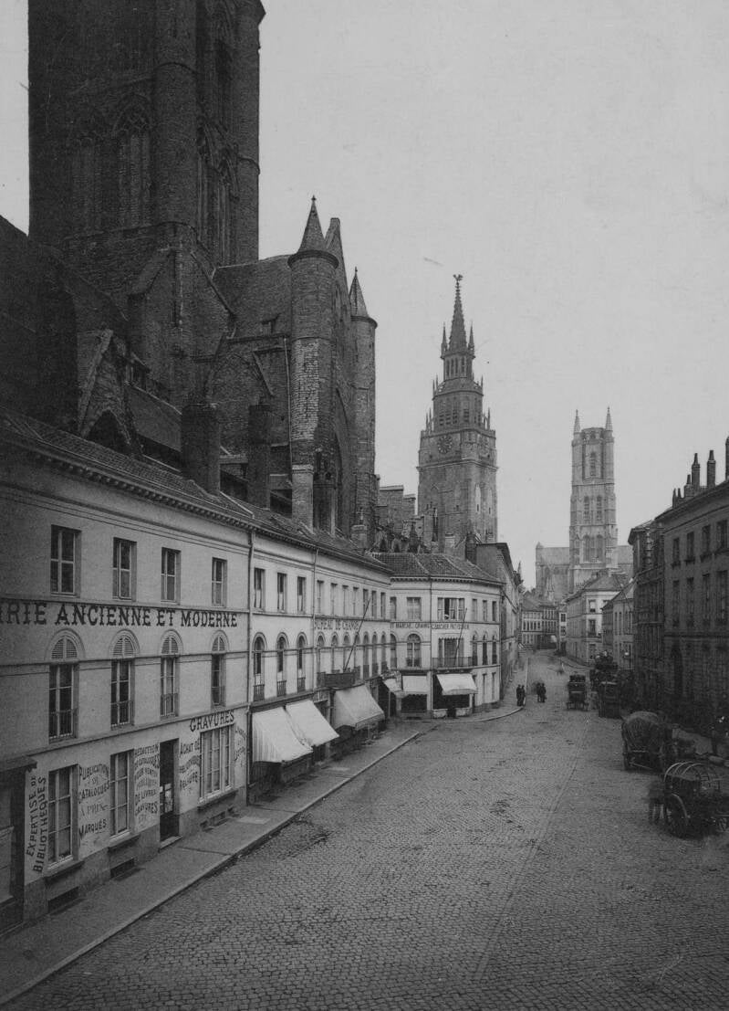 Tussen 1900 en 1913 werd met het oog op de wereldtentoonstelling de ruimte tussen het Belfort en de St.-Niklaaskerk gevrijwaard van woningen. Mede met de steun van de op 11 maart 1893 opgerichte “Maatschappij voor Geschied- en Oudheidkunde te Gent” zal het Braun-Van Asscheplan daterend mei 1896 in 1901 worden uitgevoerd. Bij deze ontmanteling zijn in een eerste fase de woningen gesloopt grenzend aan de St.-Niklaaskerk op de Korenmarkt en in de Cataloniëstraat tot net voorbij de zijingang. Verder bleven de woningen nog een tijdje staan waaronder een herberg die toepasselijk de naam droeg “Voor zoo lang als ’t duurt”.