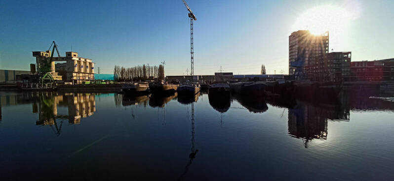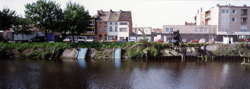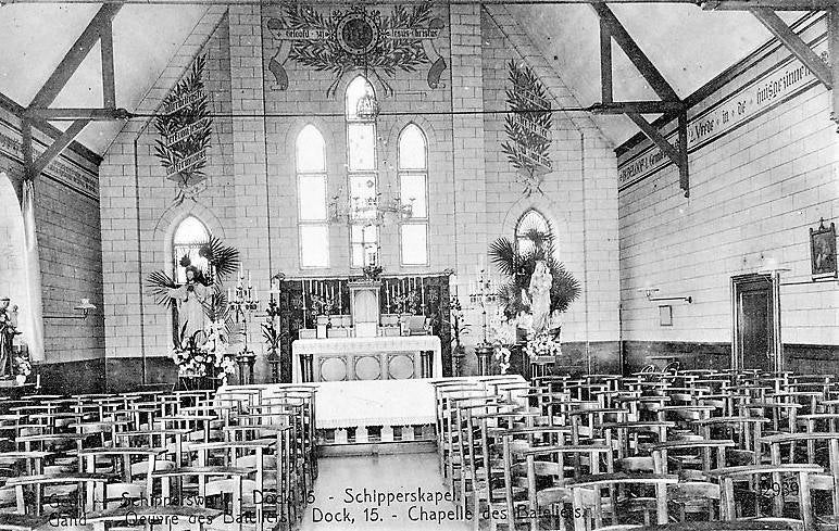 Het Handels- en Houtdok is afgelijnd door Dok-Noord. Temidden van de stapelhuizen valt het nieuwe Schippershuis en kapel op.
