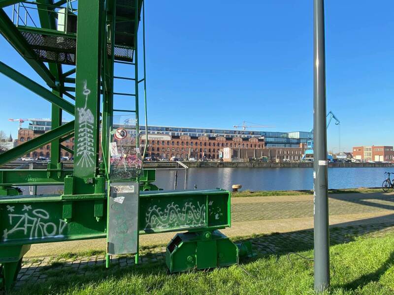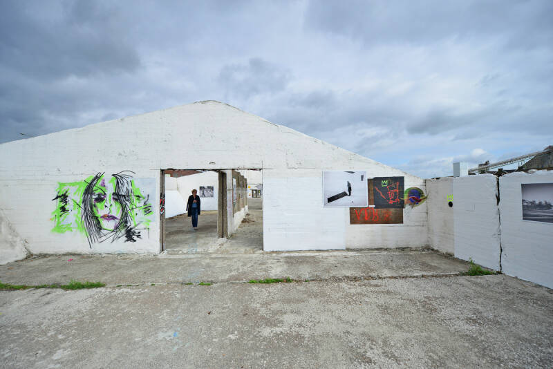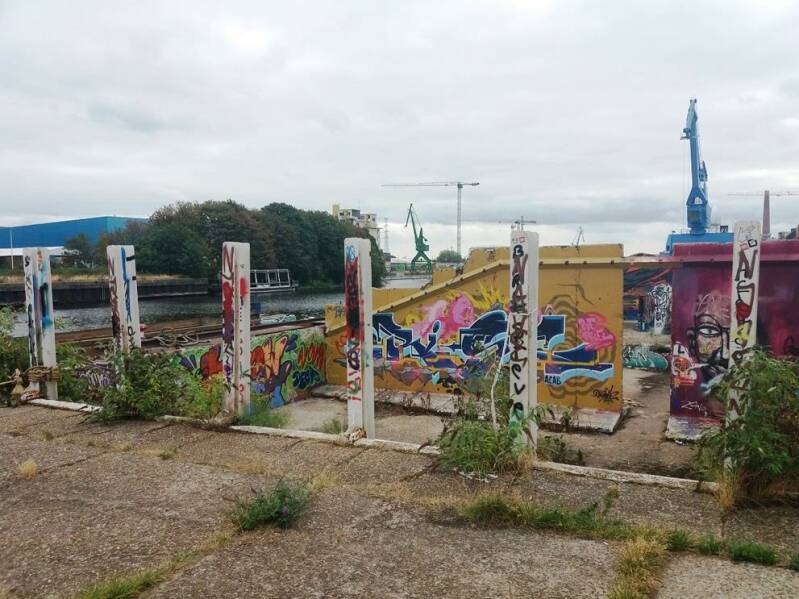 De grindbakken met zijn vele graffiti en de blauwe kraan.