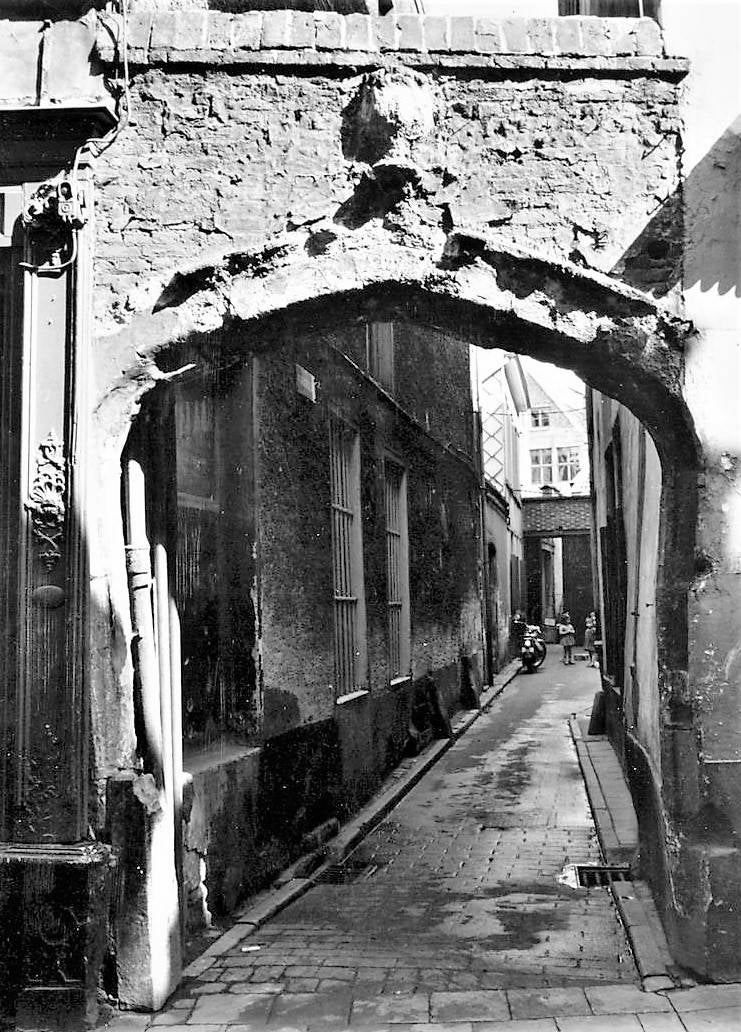 De Donkersteeg is een smal gebogen straatje dat uitmondt op de Koornmarkt waar de middeleeuwse graanmarkt plaats vond. De oude Franse benaming "rue du Paradis" zou ontleend zijn aan de herberg "Het Hemelrijck" of Hotel du Paradis, het huidige nummer 2. Vervolgens kreeg het de naam van Hemelrijkstraat. De naam Donkersteeg zou afkomstig zijn van het weinige licht dat deze ligging bereiken kon, mede door de vele luifels en het eerste verdiep dat eertijds uitstak.Alhoewel dit straatje voornamelijk oude kernen bevat, die zelfs zouden opklimmen tot de 11de eeuw, wordt het huidige straatbeeld bepaald door bepleisterde en witgeschilderde lijstgevels uit het eerste helft van de 19de eeuw met verspringende kroonlijsten. Thans pittoresk winkelstraatje. De toegang tot een doodlopend steegje met vervallen woningen en achterhuizen, genaamd de Paradijszak, wordt gevormd door een zeer verweerd poortje van circa 1500 (tussen nummer 22 en 24