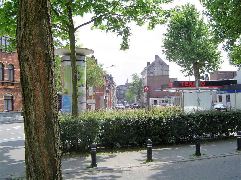 Daartegenover tekent zich een rond afgezoomd grasperk af waarop in 1976 het bronzen beeld van Fray Pedro de Gante, missionaris in Mexico (1480?-1572) geplaatst werd.