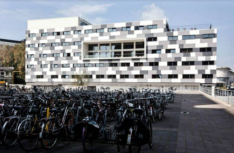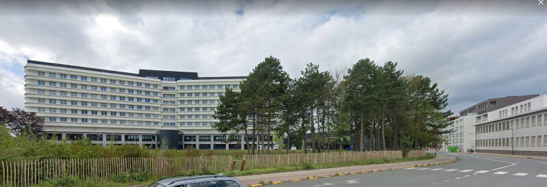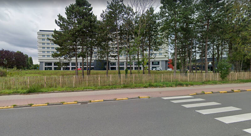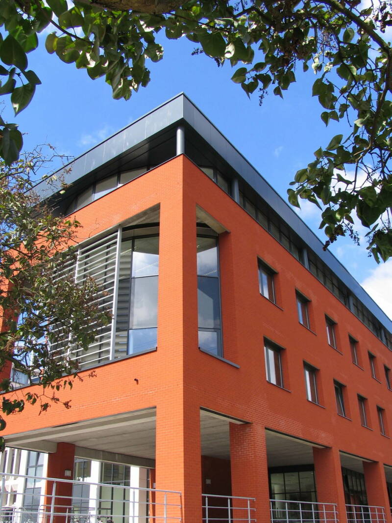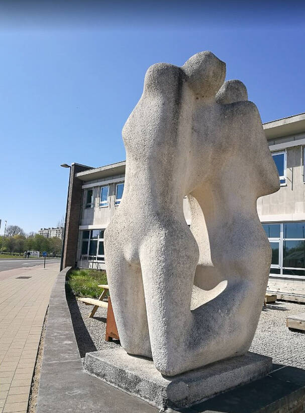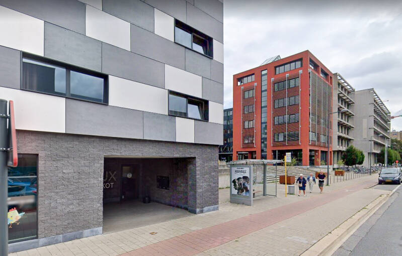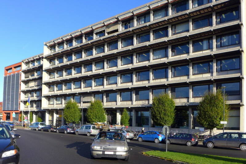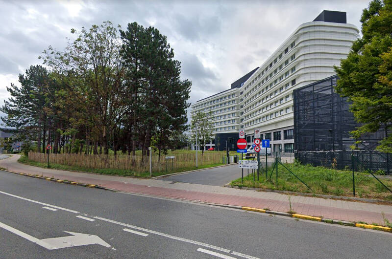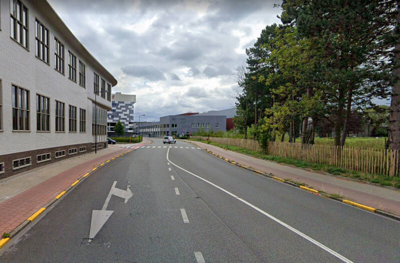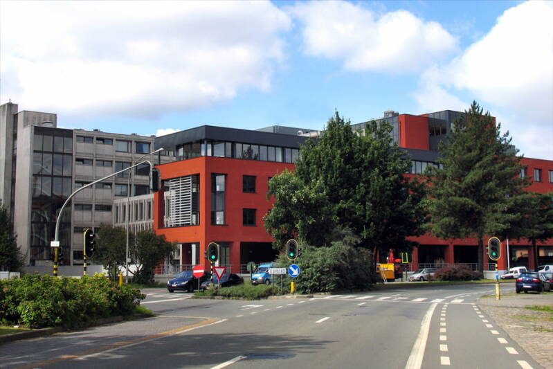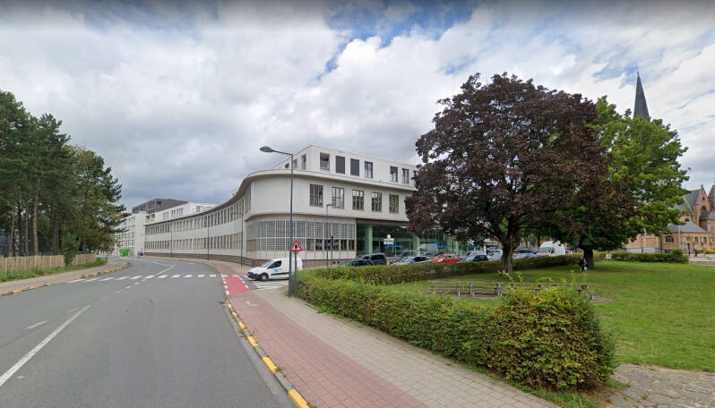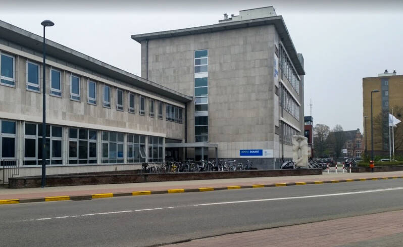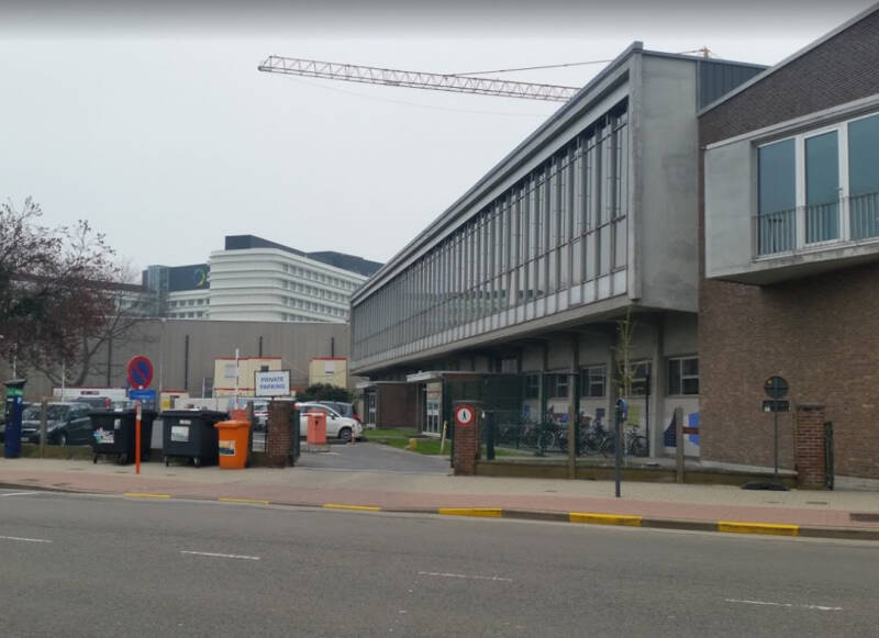 Het gebouw werd opgetrokken op een fundering van Franki-palen en bestaat uit een skelet van gewapend beton. De vleugel aan de Henri Dunantlaan telt twee bouwlagen onder een plat dak en de heel regelmatige straatgevel hiervan wordt gekenmerkt door twaalf identieke traveeën met betonnen kroonlijst. De bouwlagen en traveeën worden benadrukt door het gebruik van betonpanelen voor de lateien en de licht vooruitspringende pijlers. De invulling bestaat uit een bakstenen borstwering en grote vensters met aluminium ramen. Rechts van dit volume bevindt zich de traphal met een aluminium gordijngevel die bijna volledig beglaasd is en zicht geeft op de lichte, elegante draaitrap. Op de begane grond, rechts van de ingang bevindt zich een kleurrijk figuratief wandkunstwerk van Jean-Pierre De Vynck. De twee zijgevels van dit straatvolume zijn grotendeels blind en in baksteen (aan de westzijde met een herdenkingssteen). De noord-zuidgerichte vleugel is iets hoger opgetrokken dan de straatvleugel, heeft een licht hellend dak en wordt bekleed met betonpanelen op een sokkel van baksteen.