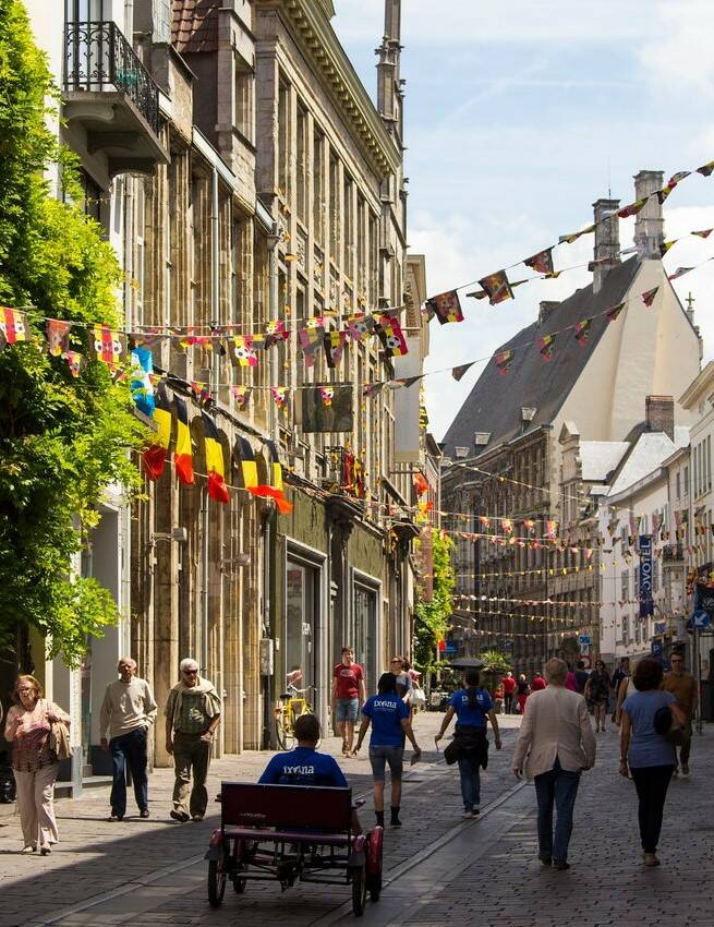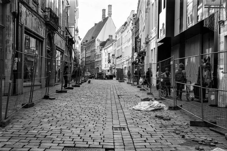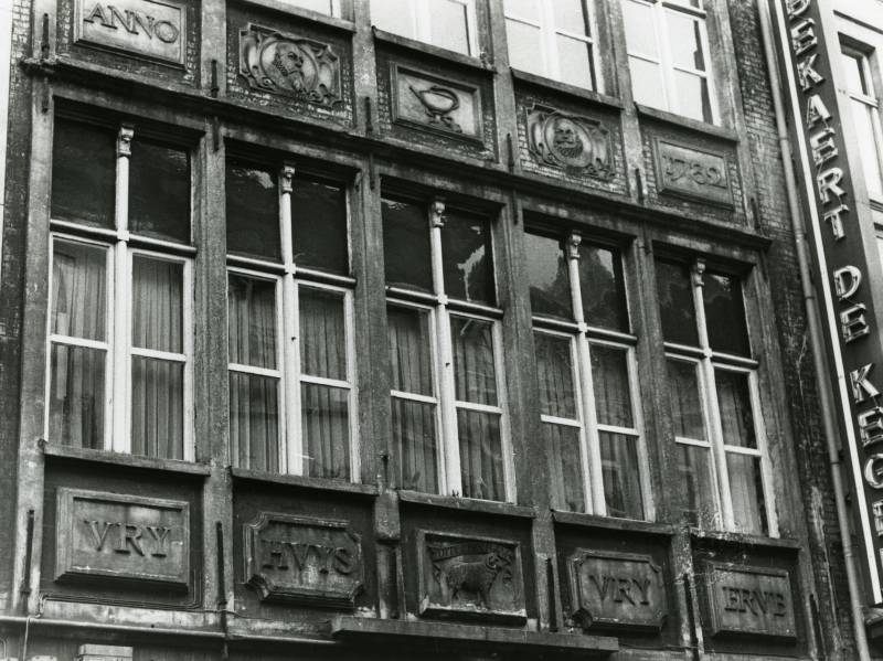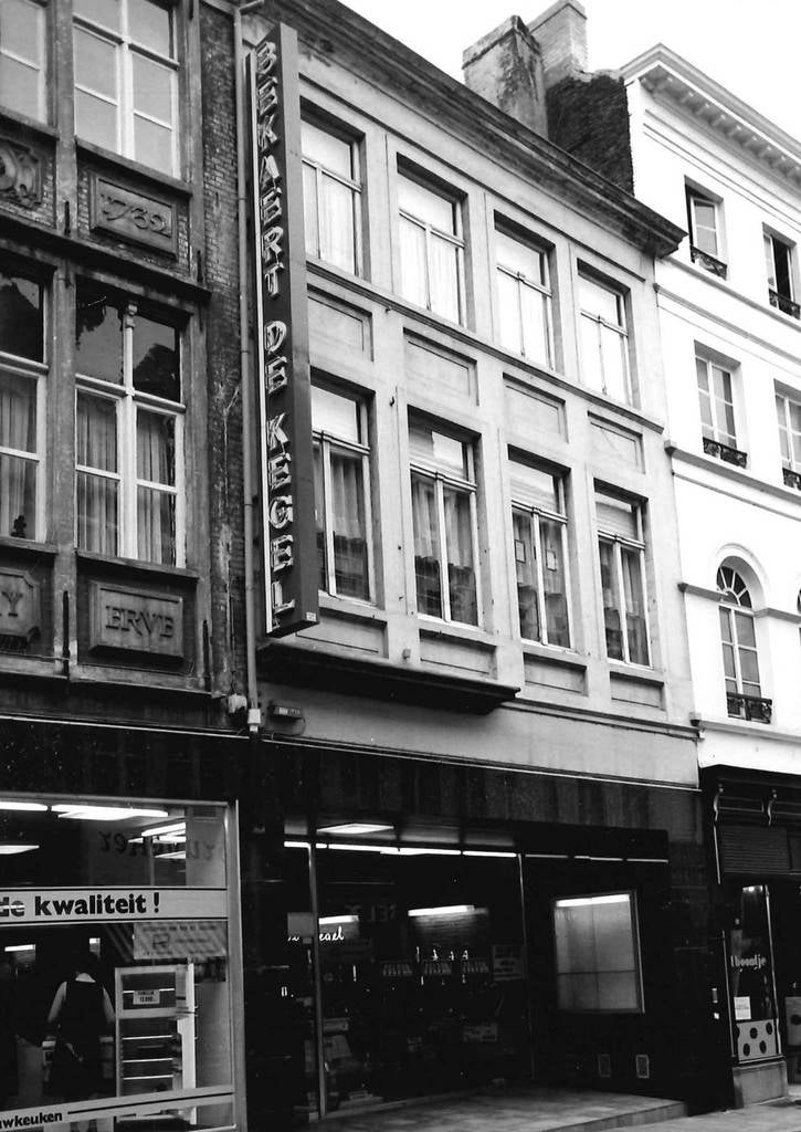 Onverbiddelijke, onmeedogende wet die wil dat de handel het best bloeit in het stadsmidden, daar waar ook de mooiste getuigen van het verleden sedert eeuwen hun pracht tentoonspreiden, zodat onvermijdelijk op die plaatsen, in die straten waar elke vierkante meter goud waard is, een bestendig conflict ontstaat tussen het schone en het utilitaire. Conflict dat elders vaak in der minne, tot voldoening, én van de bewonderaars van het schone, én van de handelaars wordt geregeld, maar dat in onze stad veel te zelden zijn oplossing vindt in een gelukkig architecturaal en esthetisch compromis, Enkel de openbare gebouwen hebben het hun bestemming te danken dat zij, in dé meeste gevallen hun gevels ongeschonden hebben behouden of in hun oorspronkelijke pracht zagen herrijzen. Maar voor het overige, vooral dan ter hoogte van de begane grond, is oneindig veel verknoeid geworden. Wij zullen bij het einde van onze studie de lijst opmaken van de wijzigingen - enkele herstellingen en zeer veel verminkingen - die de laatste 75 jaar aan de gevels van deze straat werden gebracht en meer schade dan verfraaiing voor gevolg hadden.