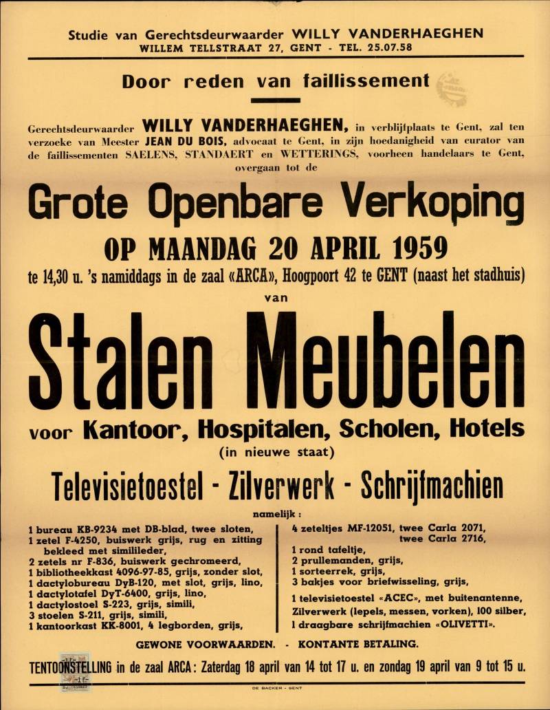 Op de laatste meidag van 1835 verscheen In de Gazette van Gend, in de zogeheten notariële aankondigingen het bericht dat notaris Van de Poele, op 27 juni in de afspanning de Posthoorn in de Kromsteeg openbaar zou verkopen: ‘Een groot en aanzienlijk huys, stede ende erve, van ouds genaemd den Grooten Arend, gestaen en gelegen te Gend, ten voorhoofde op de Hoogpoort, geteekend no. 32, hebbende menigvuldige Beneden- en Boven-Kamers van twee verdiepingen, met groote zolders daer boven, voorts Salons behangen met kostelijke tapijten, spiegels en marmeren schouwen, schoonen Trap, Keu ken met water- en regenpompen, Hoving en dry spacieuse Kelders... Teken en symbool des tijds: teken van de standing van deze straat, symbool van de welstand van de mensen die er toen woonden. Wat meer dan een eeuw later, in 1961, geplukt in een van de talrijke notariële aankondigingen: “Vrijwillige openbare verkoping van een belangrijk centraal gelegen ruim handelscomplex met inrijpoort, te Gent, Hoogpoort nr. 43, zijnde winkelhuis met toonzalen, magazijnen, kelders, 4 garages en koer. Enige zitdag: donderdag 18 mei 1961” Andermaal teken en symbool des tijds, maar het accent is verlegd geworden van weelde en schoonheid naar het commerciële en het functionele: de salons behangen met kostelijke tapijten en de marmeren schouwen zijn op de gele aanplakbrieven een winkelhuis met toonzalen geworden, De ‘hoving en dry spacieuse kelders’ zijn er prozaïsch 'vier garages met koer’ in vette druk geworden. Langzaam maar zeker hebben handel en nering er zich, zoals overal elders in de oude stadskuip, ingeplant met hun moderne uitstalramen, hun lichtreclames, neonbakken, met hun brede, banale inrijpoorten, die de koetspoorten van weleer hebben verdrongen.