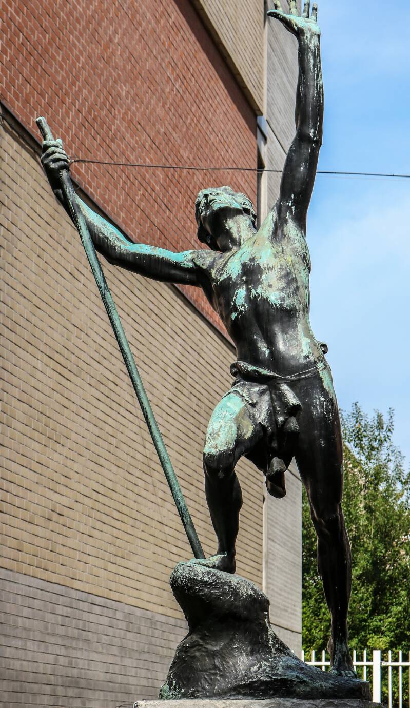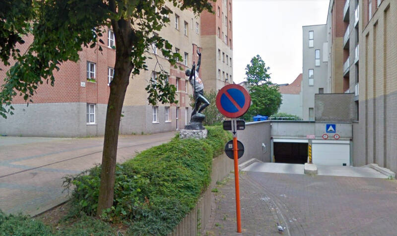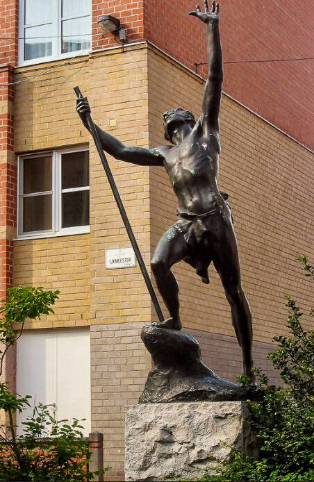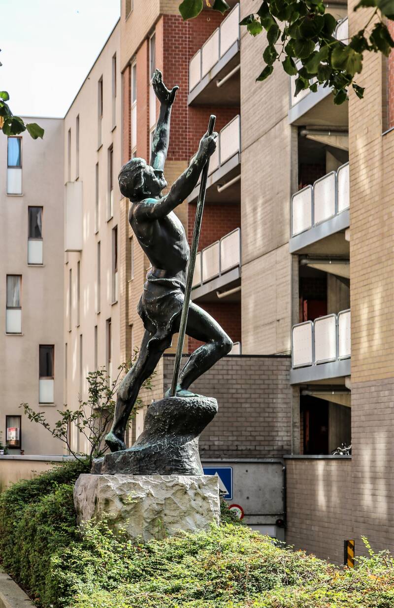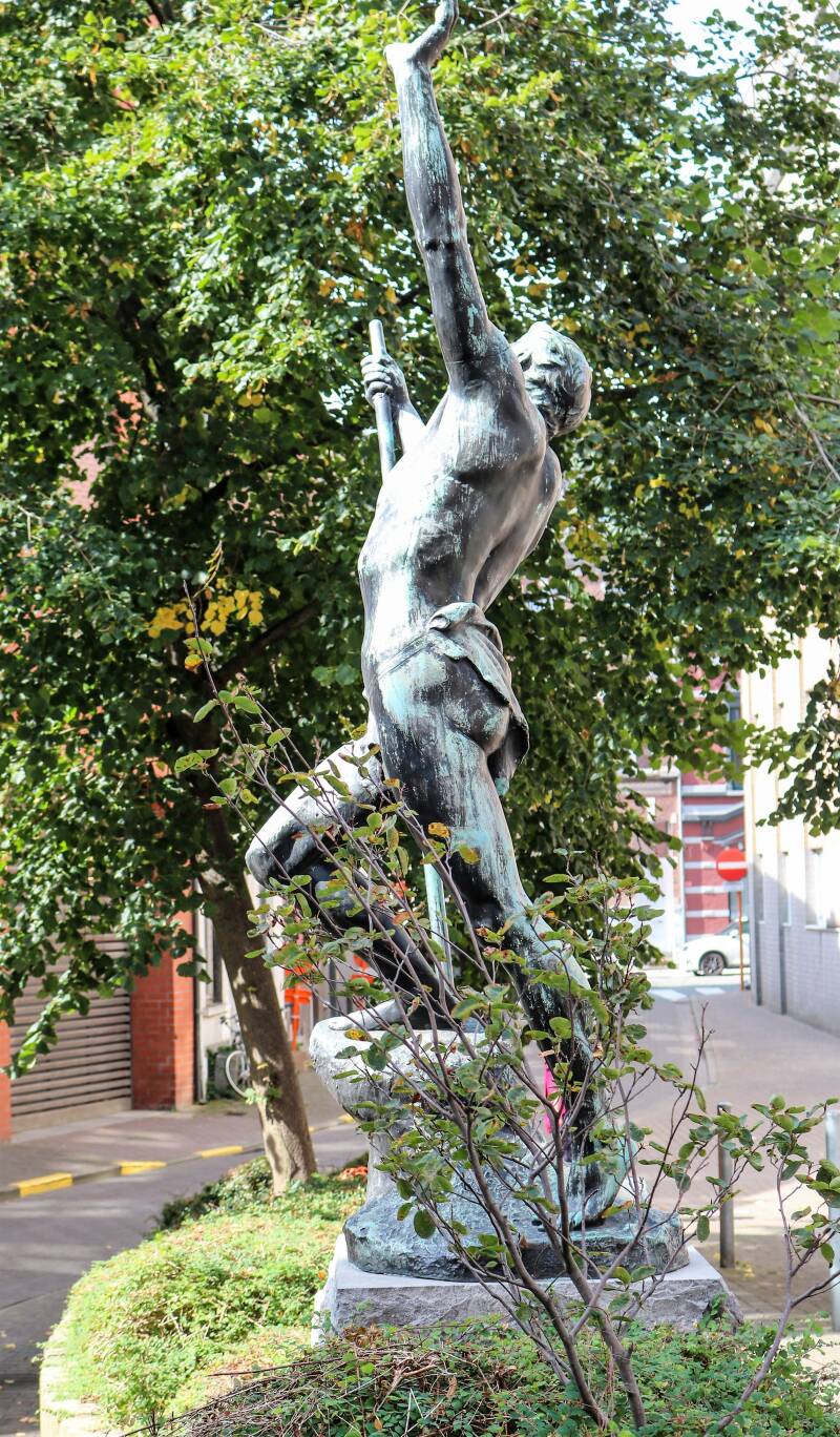Het kunstwerk, een standbeeld, is afkomstig uit de Statiestraat, naast het Zuidstation. Het beeld kreeg de volkse benaming “De Vliegenvanger“. Officieel heet het ‘Excelsior’, net zoals de terziele gegane brouwerij. “Eigenlijk is het een uitgebeeld gedicht van Jan van Beers. Geen Gentenaar, maar een Antwerpenaar die met zijn gedichtenbundel ‘Jongelingsdromen’ debuteerde in 1853. En daar staat onder andere een gedicht in over een jonge man die de bergen in trekt. Hij klimt en klimt, steeds hoger en hoger maar uiteindelijk stort hij uitgeput neer en zijn laatste woord is: Excelsior!”