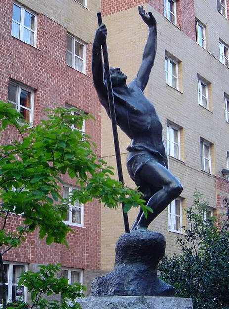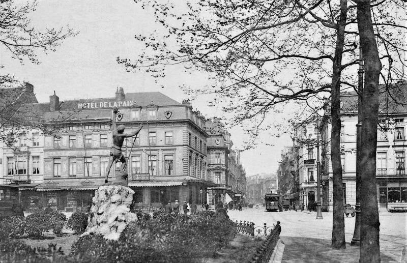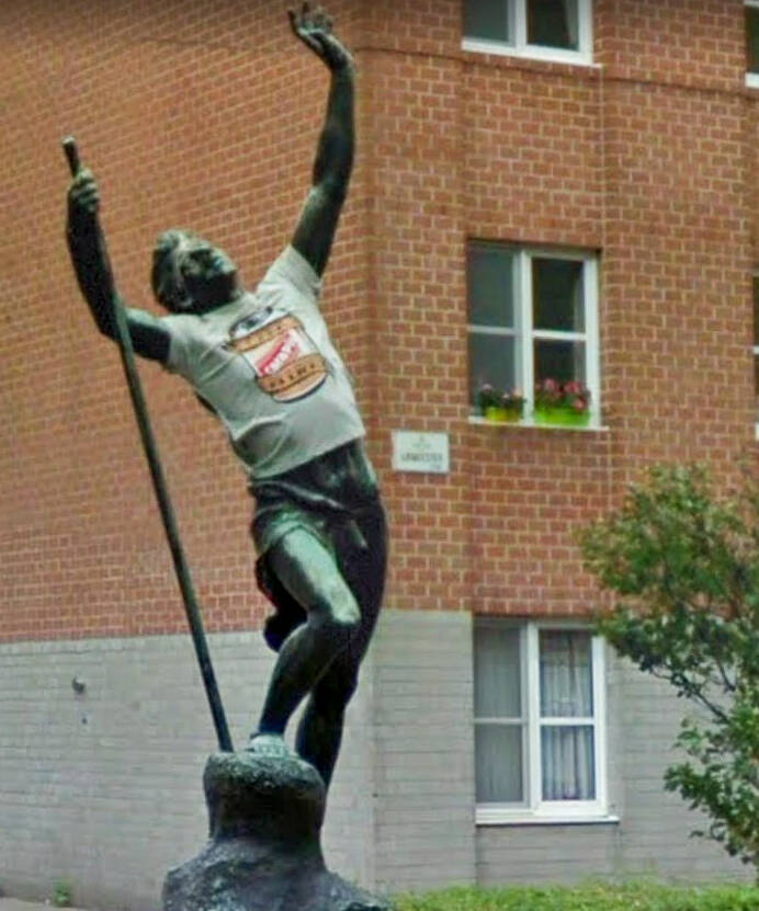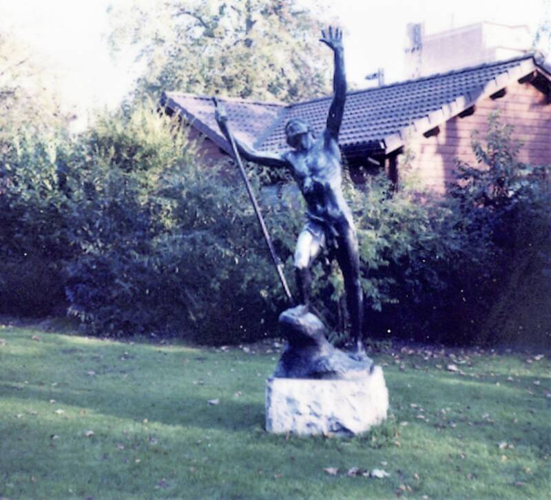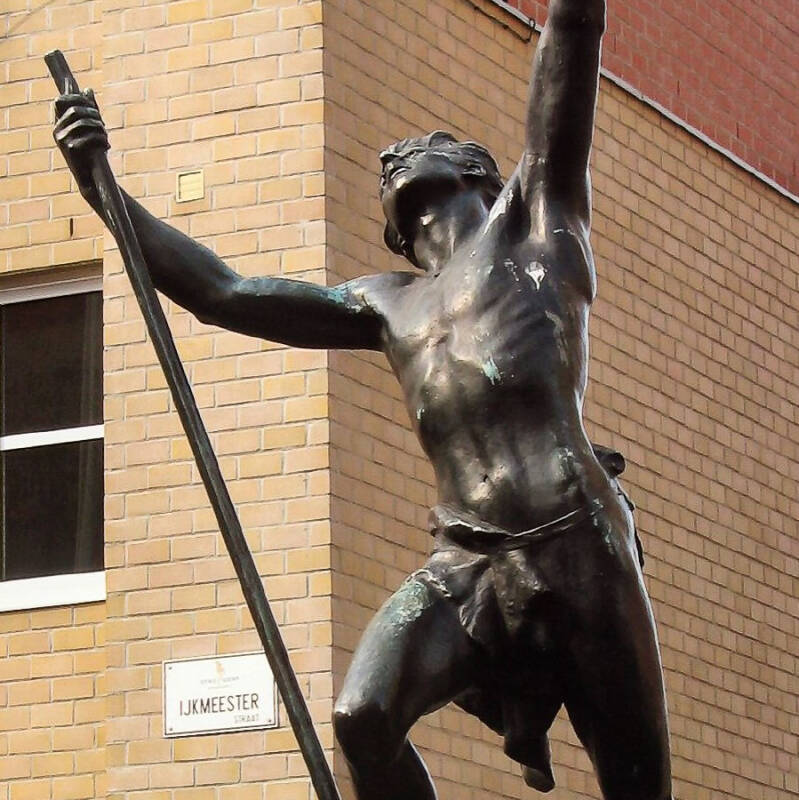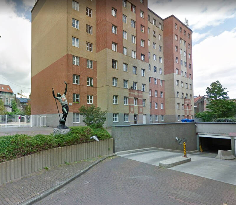 Het kunstwerk, een standbeeld, is afkomstig uit de Statiestraat, naast het Zuidstation. Het beeld kreeg de volkse benaming “De Vliegenvanger“. Officieel heet het ‘Excelsior’, net zoals de terziele gegane brouwerij. “Eigenlijk is het een uitgebeeld gedicht van Jan van Beers. Geen Gentenaar, maar een Antwerpenaar die met zijn gedichtenbundel ‘Jongelingsdromen’ debuteerde in 1853. En daar staat onder andere een gedicht in over een jonge man die de bergen in trekt. Hij klimt en klimt, steeds hoger en hoger maar uiteindelijk stort hij uitgeput neer en zijn laatste woord is: Excelsior!”