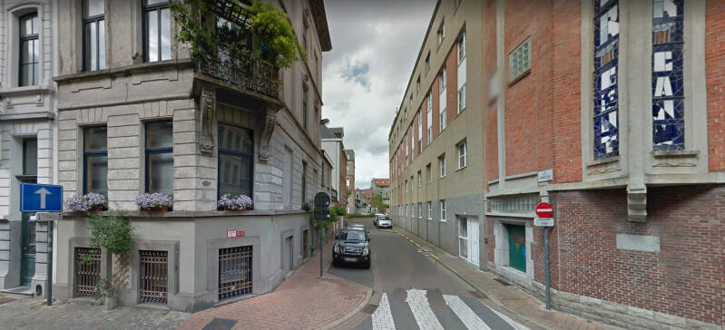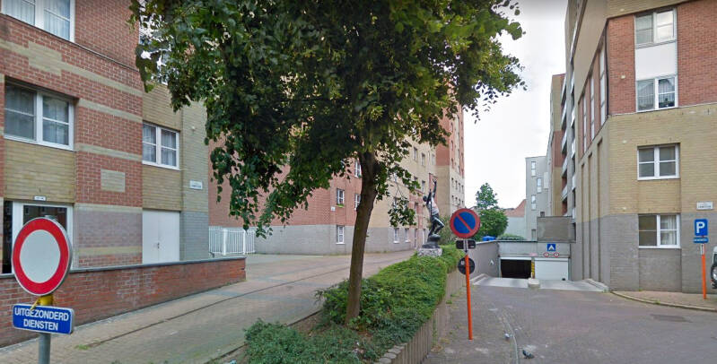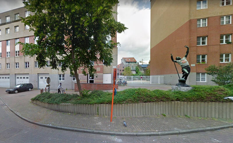 De straat loopt in een ‘t-vorm’ en wordt in het centrum een soortement pleintje met op een muurtje een kunstwerk.