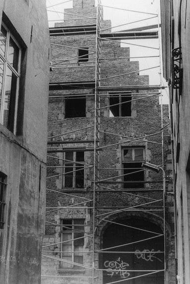Homogeen straatbeeld van oude, doch verwaarloosde huizen of gevels. De zuidkant wordt bijna volledig ingenomen door bijgebouwen van de "hotels" van de Burgstraat, terwijl de overkant, tot de oprichting van de Berg van Barmhartigheid in 1621, behoorde tot het "Dondersteen" en nu voornamelijk bepleisterde lijstgevels telt.