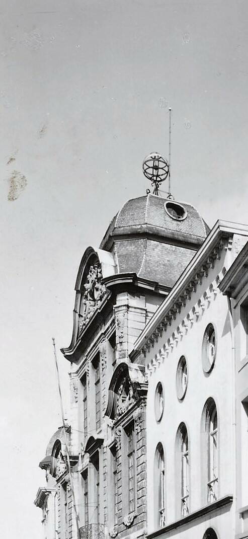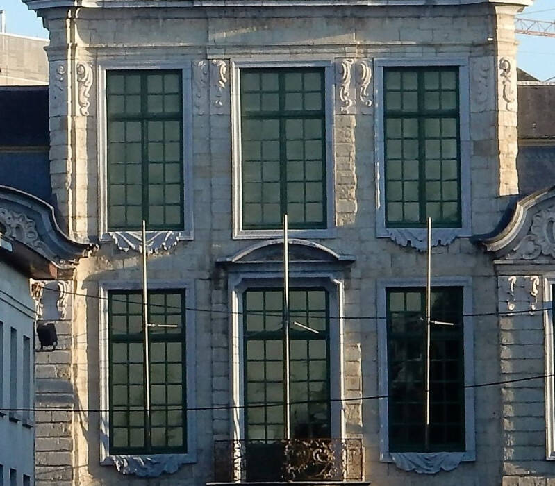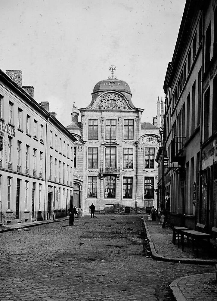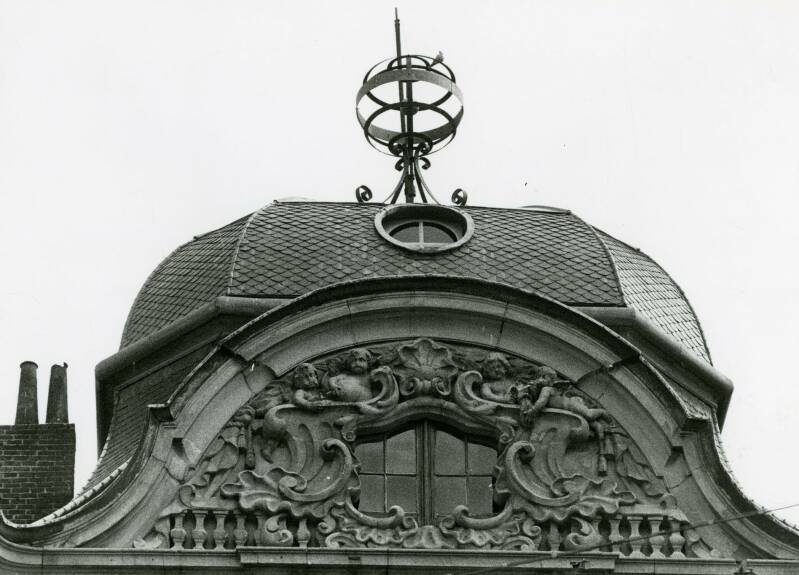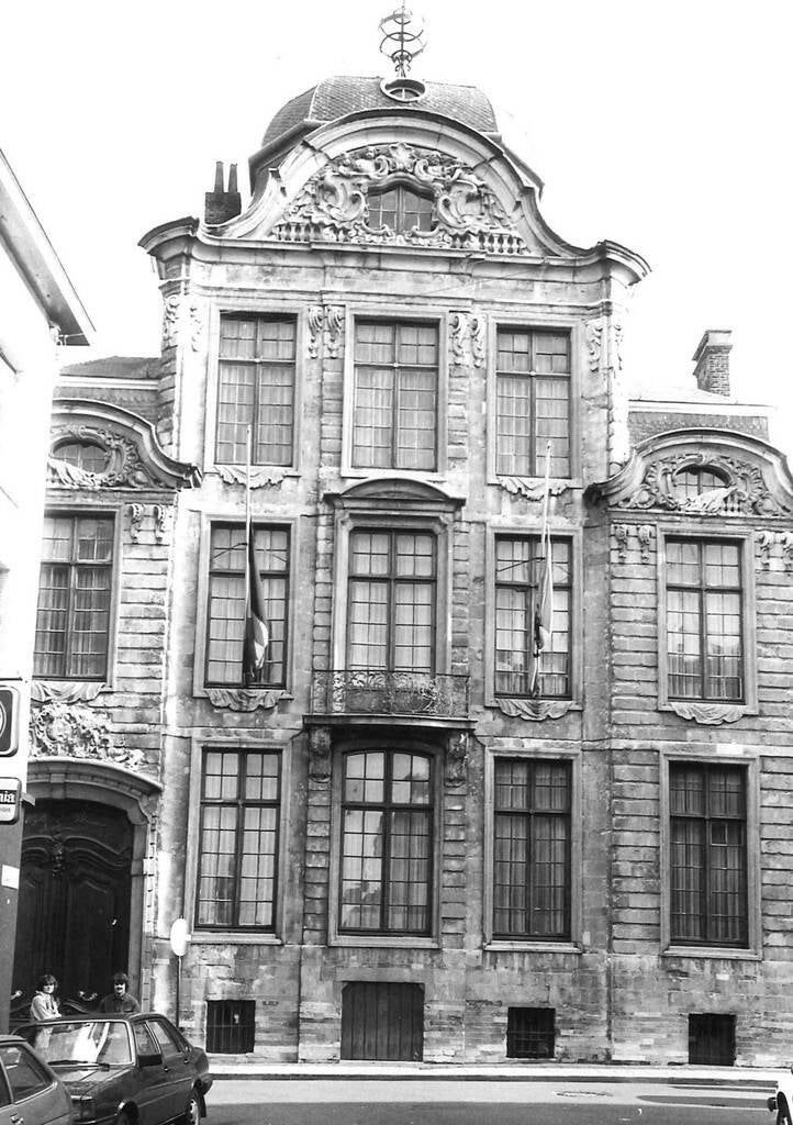 Oorspronkelijk rechthoekige plattegrond met links van de voorgevel L-vormige aanbouw, totaal verdwenen op één travee na. L-vormige aanbouw rondom rechthoekig binnentuintje uit 1905. Vanop Vrijdagmarkt doorheen Kammerstraat uitzicht op de prachtige voorgevel die doorgaat als één der best geslaagde voorbeelden van Gentse rococo-architectuur. Harmonisch opgebouwde gevel, in Lodewijk XV-stijl; van vijf traveeën en twee bouwlagen met mansardedak (leien) en koepelvormige afdekking van middenpartij bekroond met wereldbol, van 1746 naar ontwerp van David 't Kindt. Opgetrokken uit Ledesteen, gebeeldhouwde delen bij restauratie van 1906 vervangen door Franse zandsteen.