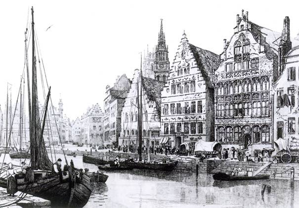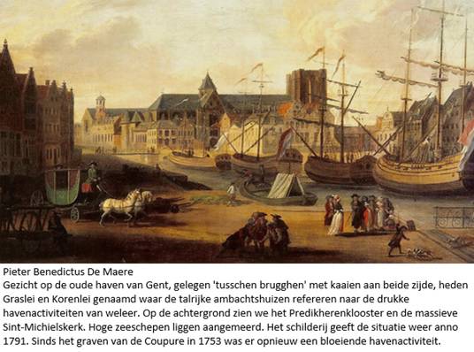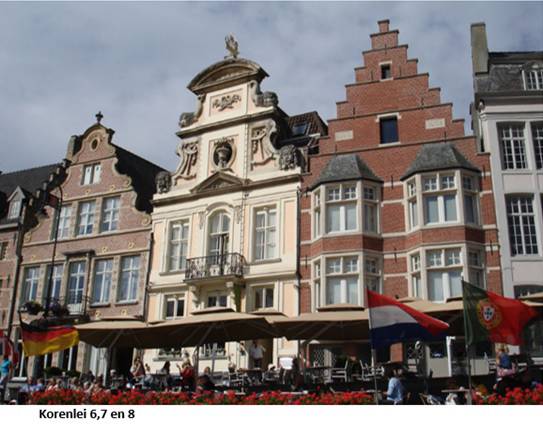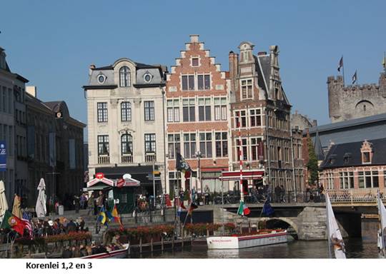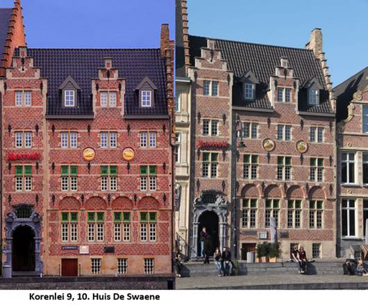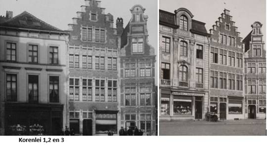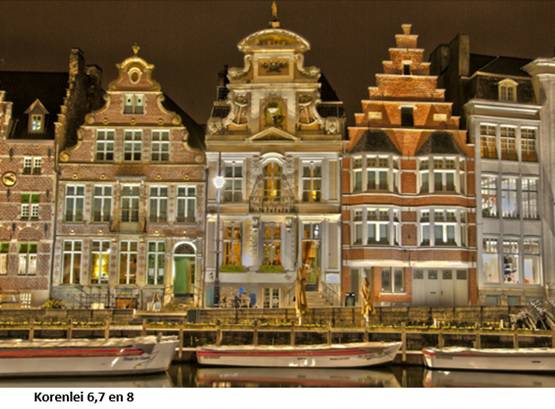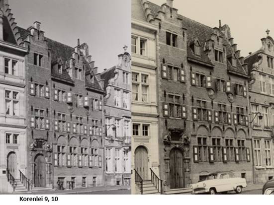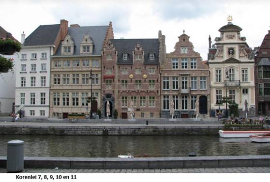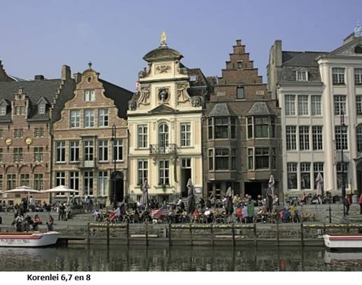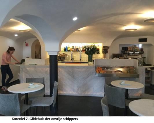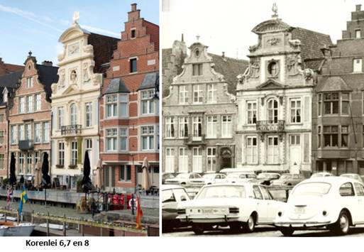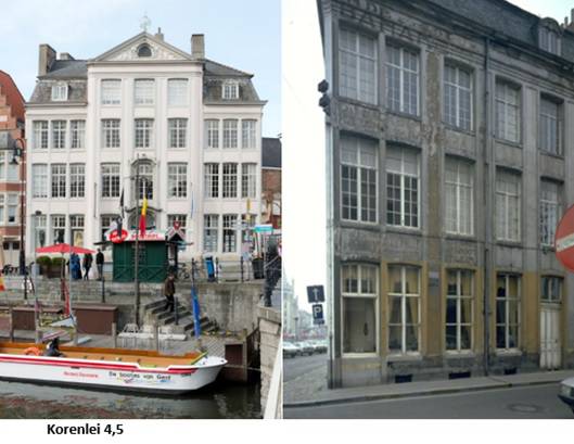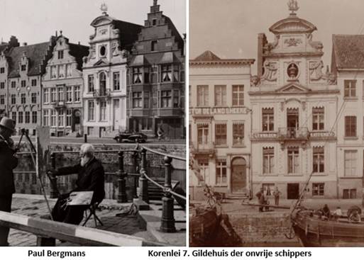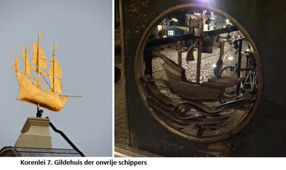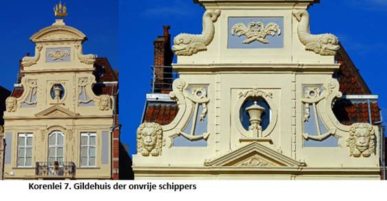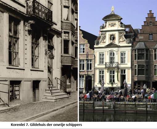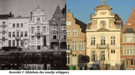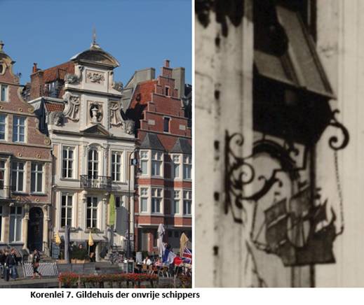 Het gildehuis van de Korenmeters in Vlaamse renaissance stijl en het gildehuis van de Vrije Schippers stammen uit respectievelijk 1698 en 1531. Dat schippersgilde was oppermachtig want als schippers van buiten Gent door de stad wilden varen moesten ze hun vracht overladen op Gentse boten. Dit gebruik werd in 1663 afgeschaft, waarop de ‘onvrije schippers’ onmiddellijk hun eigen gildehuis bouwden, ‘Den Ancker’ op de Korenlei nummer 7.