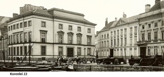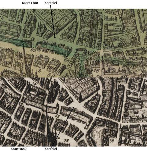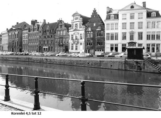 Vanaf de 11de eeuw was de Korenlei een soort aanlegsteiger om goederen (voornamelijk graan uit Artesië) snel naar de aanpalende pakhuizen te brengen of om goederen af te halen. Gent bezat het zogenaamde graanstapelrecht, waardoor het graan dat vanuit Noord-Frankrijk kwam, via Gent moest lopen. Het graan moest eerst twee weken op de graanstapelplaats liggen, voordat het verhandeld mocht worden op de markt van Gent. Verschillende panden herinneren sterk aan die activiteiten en weerspiegelen de bloei van de Gentse ambachten en neringen.