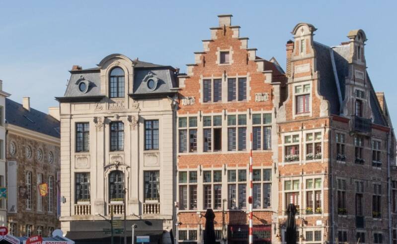 De belangrijkste architecturale elementen – het zadeldak en de schouwvolumes – kregen in de voorgevel een afwerking in natuursteen. Deze blauwe hardsteen zorgt voor een neutrale kleur waardoor het dakvolume van op de Graslei minder uitdrukkelijk aanwezig is. De hedendaagse natuursteen afwerking suggereert op een subtiele manier de nieuwe functie van het nieuwe dakvolume. Het schuine dak in natuursteen werd opgevat als een schil met open voegen waaronder de effectieve waterdichting zit.