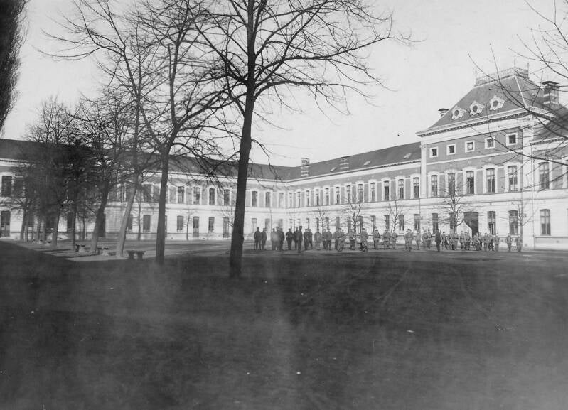 Het oorspronkelijke neoclassicistisch complex op rechthoekige plattegrond bestond uit vier vleugels omheen een enorme binnenkoer (5750m²) met een vijfentwintig traveeën brede voorgevel met centraal risaliet en twee dwarsvleugels met zes vooruitspringende traveeën ten overstaan van de voorgevel. Links en rechts lagere aanbouwsels ter hoogte van laatstgenoemde waardoor voortuintjes ontstonden.