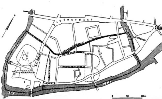 Bij het deels openleggen van de gracht in 1994, aan de zijkant van de kapel van de Norbertijnen heeft men de ringen in de kaaimuren, waaraan de scheepjes werden vastgemaakt, teruggevonden. Gezien de doorsnede van de ringen (sommige hadden een doorsnede van25 mm.) mag men aannemen dat men met snelle stroming rekening hield. De gracht, die daar een breedte had van ongeveer vier meter, was tamelijk diep. Bij het uitgraven van het vulmateriaal tot een diepte van 4 meter onder het maaiveld, was de moederbodem nog niet bereikt.
