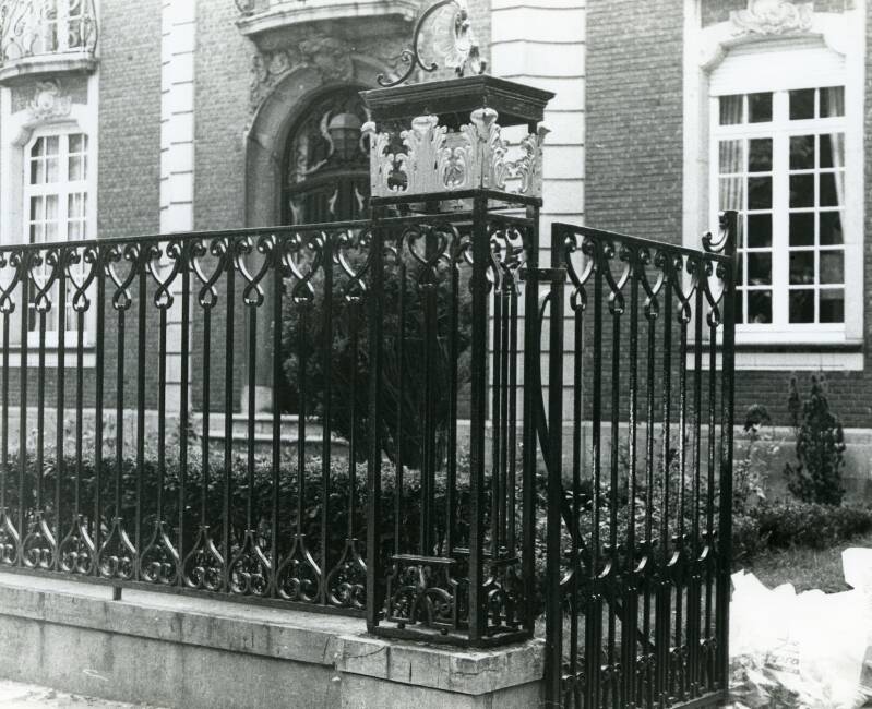 Een vijver met monumentale fontein en het spectaculair bronzen beeld van het Ros Beyaert met vier heemskinderen naar ontwerp van de beeldhouwers Alois De Beule en Domien Ingels (voor het paard) prijkte in het midden. Het standbeeld bleek nadien nog onmogelijk te verplaatsen en bleef dan ook ter plaatse in zijn cirkelvormig vijvertje. De fontein werd vervangen door een grasperk. Dit vormt het centrum van het huidige plein met ovale plattegrond, afgezoomd door bomen. In het park werden nog een aantal kleinere bronzen beelden geplaatst.
