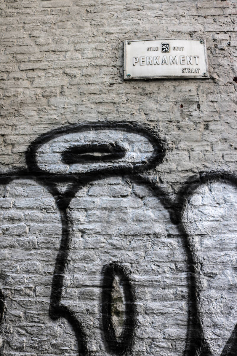 De Perkamentstraat is een bochtig, smal zijsteegje van de Burgstraat, aanvankelijk uitkomend op de Houtlei, heden doodlopend. Het is een straatje waar je zo voorbijloopt, ware het niet dat de enen zijgevel een groot graffitiwerk bevat. Heeft onlangs een fijne update gekregen door de stad.
