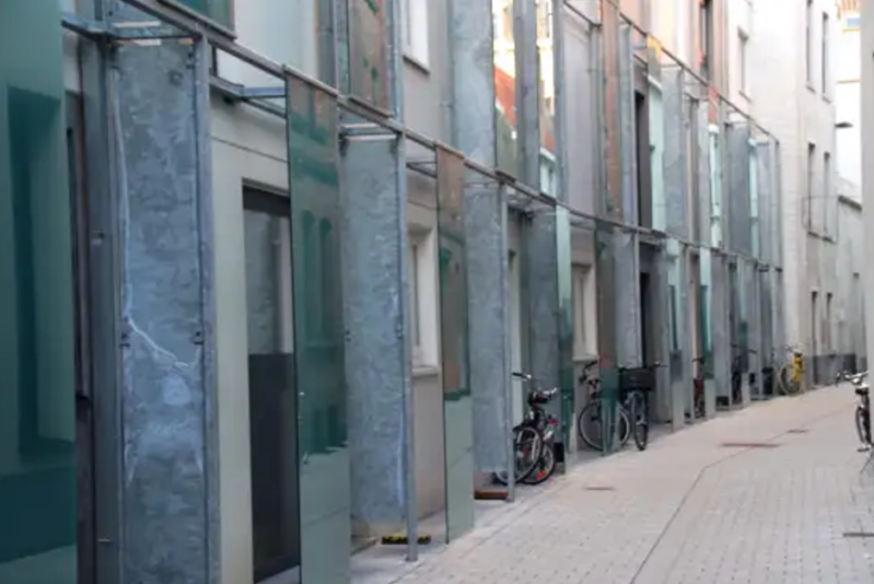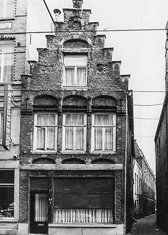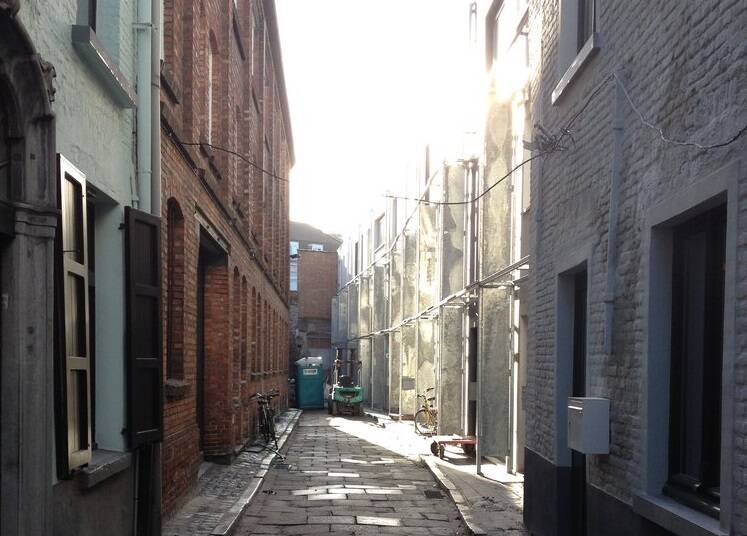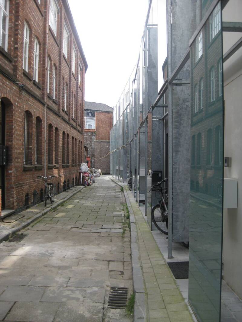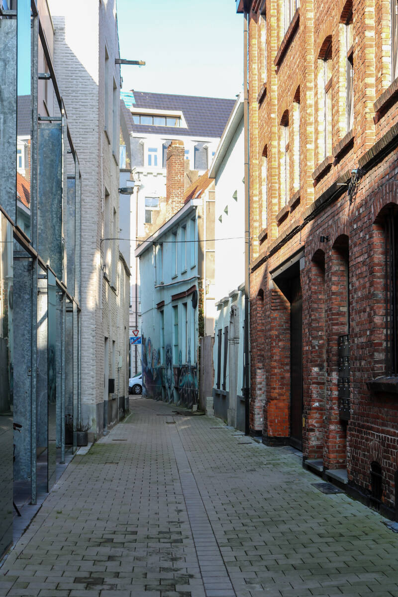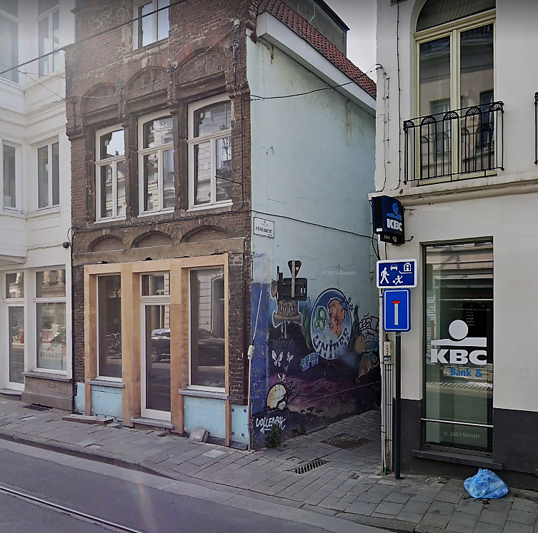 De linker wand is volledig ingenomen door een bakstenen vleugel van de pianofabriek Van Hyfte, horende bij Burgstraat nummer 27.