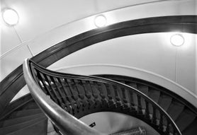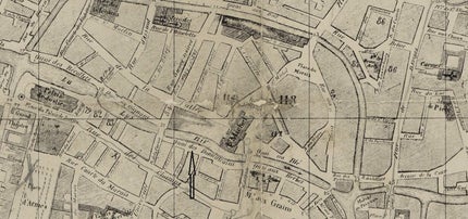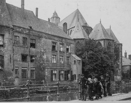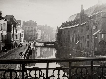 Natuurstenen kaaimuren, afgezet met gietijzeren, met leeuwenkopjes versierde balustrade.
