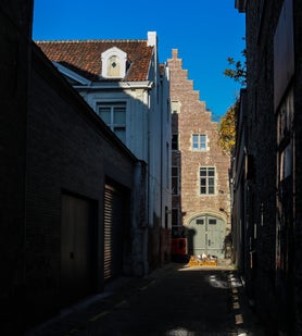 Homogeen straatbeeld van oude, doch verwaarloosde huizen of gevels. De zuidkant wordt bijna volledig ingenomen door bijgebouwen van de "hotels" van de Burgstraat, terwijl de overkant, tot de oprichting van de Berg van Barmhartigheid in 1621, behoorde tot het "Dondersteen" en nu voornamelijk bepleisterde lijstgevels telt.