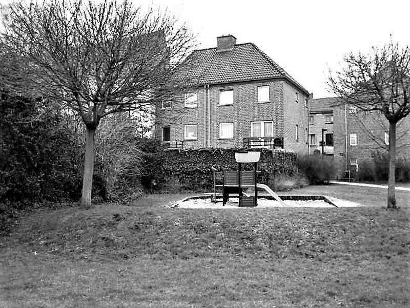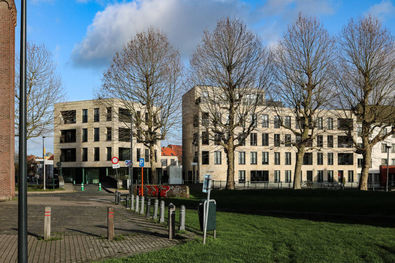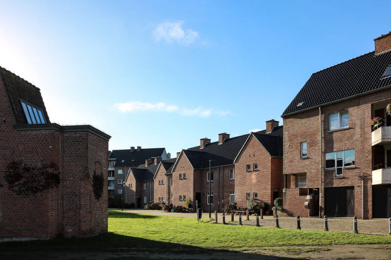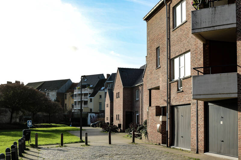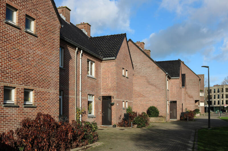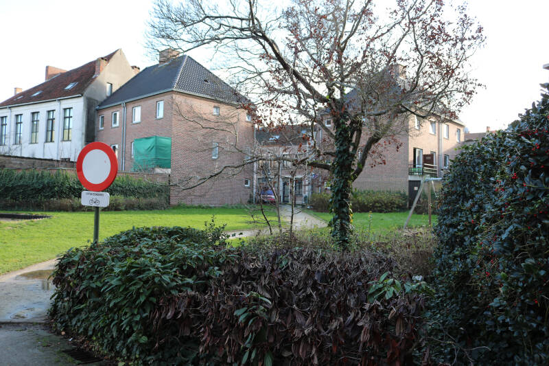 Klein straatje met alleen maar nieuwbouw. Sluit het Hof ter Walle af, met de Gentse stroppendrager op het midden van het plein