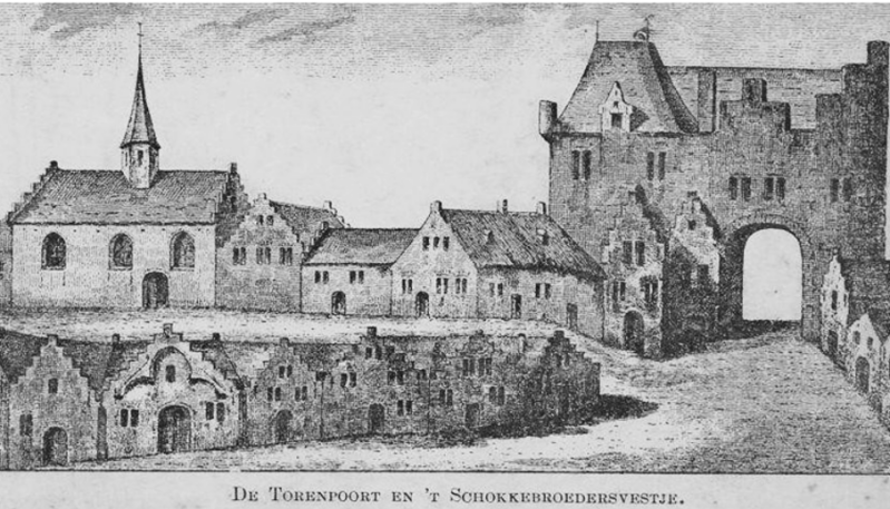Aan de Poel, een van de oudste en merkwaardigste plaatsen van Gent waar ooit eens de machtige middeleeuwse Turrepoort of Torrepoort verrees, was tot in het begin van deze eeuw de Sint-Michielsveste of Broederkinsveste, ook Schokkebroersvestje geheten, gelegen. Toen het ophield te bestaan en voor goed uit het Gents stadsbeeld verdween, had het een heel, heel lange en soms bewogen geschiedenis achter de rug tijdens dewelke het veel had meegemaakt, gezien en beleefd. Over de Poel, waar ook vandaag nog een aantal mooie gebouwen en herenwoningen uit diverse bouwperiodes aan een groots verleden herinneren, kan men niet schrijven zonder stil te staan bij wat gedurende zoveel eeuwen mede tot de geschiedenis van deze plaats en haar omgeving heeft behoord : het Schokkebroersvestje en zij die er gewoond, geleefd en gewerkt hebben. Maar laten we beginnen bij het begin, bij de oorsprong. De Sint-Michielsveste behoorde bij de omwalling van de westelijke verdedigingsgordel van de stad bestaande uit : de Gracht - Houtlei - die vóór 1190 en vermoedelijk rond 1100 werd gegraven (over het juiste tijdstip lopen de meningen uiteen); uit de grote, stevige vestingmuur, die beheerst werd door torens en versterkte poorten : het Wijkhuis, de Zandpoort, de Posteernepoort, de Torrepoort, deze laatste ook Drongenpoort of Torhoutpoort genoemd, die gebouwd werd tegen het einde van de 12de eeuw, waarschijnlijk omstreeks 1190. De Gracht omsloot de Sint-Michielswijk, de eerste uitbreiding van de middeleeuwse Gentse stadskern over de Leie- "Overleie"- in de 12de eeuw. Maar reeds in de 14de eeuw verloor de Turrepoort haar nut in het oorspronkelijk verdedigingssysteem en was ze niet meer dienstig voor haar aanvankelijke bestemming. Ze werd ten dele van de hand gedaan en ten dele verpacht. De Gentse Schepenen stonden in 1313 vier bastions, een paar torens en enkele wachthuisjes op de Veste af aan "broederkins", die er een jaarlijkse cijns moesten voor betalen en er zich kwamen vestigen. Die "broederkins" verbleven dus "up een hoochte ghenaemt het vestjen" en deze hoogte kon men vanop de Poel (aan de zuidkant van het pleintje) langs een zachte helling bereiken. De Sint-Michielsveste was nochtans niet de eerste verblijfplaats van die "broederkins" in onze stad, want volgens De Potter woonden ze achtereenvolgens in het huis "den hoogen Gevel", "tusschen Muide", in de Ieperstraat, aan de Hooiaard en tenslotte op het Vestje. Met die "broederkins" ging het oorspronkelijk om een vereniging van "beggaerden" of lekebroeders, vrome leken, die in ongehuwde staat leefden, zonder geloften af te leggen en geen eigenlijke orde vormden. Ze namen de taak op zich om zieken te verzorgen, ook ten tijde van epidemieën, om doden op te baren en te begraven. Ook bij het verplegen van geestesgestoorden zijn ze werkzaam geweest en zoals we verder zullen zien, werden ze later ook nog met andere opdrachten gelast. Niet enkel in Gent trof men die Broeders aan. Het is waarschijnlijk dat omstreeks dezelfde tijd in Antwerpen ook "Cellezusters" (later Zwartzusters) verschenen. Ze behoorden tot hetzelfde genootschap als de "Cellebroeders. Cellebroeders was maar één van de namen waaronder de Broeders bekend stonden. Ze zouden eerst "Lollarts", "Lollaerds" of "Lollaerden" zijn genoemd. Dat ze ook "Cellebroeders" werden genoemd, zou verband gehouden hebben met het Latijnse woord "cella" dat betekent: kleine kamer, cel; in een tempel : kapel waar het beeld van de godheid stond. De Broeders waren ook gekend onder de naam van "Mattemannen" .Eén der betekenissen van het woord "matte" was immers: armzalige kledij, zodat het niet uitgesloten is dat de benaming "Matteman" daarmee in verband moet worden gebracht. Een "matteke" was een arm meisje of een arm vrouwke. Nu waren er ook, zoals we reeds zegden, Cellezusters of Zusters Cellieten, die men eveneens "Mattewi jven" heette. Ze behoorden tot dezelfde geestelijke vereniging als de Cellebroeders en namen de verzorging op zich van de zieken van het vrouwelijk geslacht. In Antwerpen werden de Zwarte Zusters ook Mattewijven genoemd. In Gent herinnert een straat, die loopt van Onderbergen tot Ingelandgat, namelijk de Jonkvrouw Mattestraat nog steeds aan het bestaan van de Mattewijven. Dat men de Broeders ook de naam gaf van "Schokkebroeders" zou te maken gehad hebben met het feit dat ze, bij het vervoer van doden, op de oneffen en hobbelige wegen danig schokten dat ze in de volksmond een beetje spottend "Schokkebroeders" werden genoemd. Die benaming sprak de mensen waarschijnlijk nogal aan zodat ze die dan ook gemakkelijk gebruikten en het Vestje waar de Broeders verbleven, het "Schokkebroersvestje" noemden. De Broeders op de Veste werden echter ook "Alexianen" genoemd. Dat de Broeders tegen het einde van de 15de eeuw de naam van Alexianen kregen, was geen toeval. Ze hadden immers de H. Alexius, een rijke Romeinse jongeman, die in de 4de-5de eeuw leefde en vrijwillig afstand had gedaan van al zijn bezittingen en goederen, tot beschermheilige gekozen. Na hun erkenning als orde door Rome, legden de Broeders de geloften af van zuiverheid; van derven van eigendom; en van onderdanigheid aan de wettige oversten