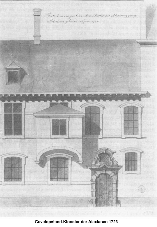 Maar hoe zag het er nu eigenlijk uit op het Schokkebroersvestje einde van de 17de eeuw, na de bouw van de nieuwe kapel, en begin van de 18de eeuw? Onder het grafisch materiaal dat zich in verband met het Schokkebroersvestje op het Gents Stadsarchief bevindt, hoofdzakelijk in de Atlas Goetghebuer, komt er een aquarel voor die de gevelopstand toont van het klooster met daarop de tekst : "Portael en overgank van het Clooster der Alexianen geseyt cellebroeders, gebauwd in 't jaer 1723" . Deze deeltekening van de gevel van het klooster is interessant omwille van de vermelding van de datum 1723 en ook omdat ze een beeld geeft van het portaal van het klooster (niet dat van de kapel) en van de aanloop van de overgang. Een goede kijk op het geheel (klooster en kapel) biedt de prent van A. Van den Eynde die de staat van de gebouwen in 1723 weergeeft en gemaakt werd in 1848 . Men onderscheidt daarop zeer goed het hierboven vermeld portaal van het klooster, de monumentale barokke ingangspoort van de kapel en het torentje op het dak. Ze laat ook duidelijk de gehele overgang zien die het Schokkebroersvestje overspande dat rechts naar de Poel liep en links naar het Watergraafstraatje. Op de afbeelding van Van den Eynde kan men ook heel even een deel van de zijkant ontwaren van de barokken geveltop van de kapel die later zou verdwijnen. Nog beter ziet men een deel van de barokke geveltop van de kapel en van het torentje op een aquarel die het Schokkebroersvestje toont wanneer men kwam van de kant van het Watergraafstraatje . Dat Watergraafstraatje had zelf en heeft nog altijd een uitgang in de Sint-Miebielsstraat en in het Ingelandgat.