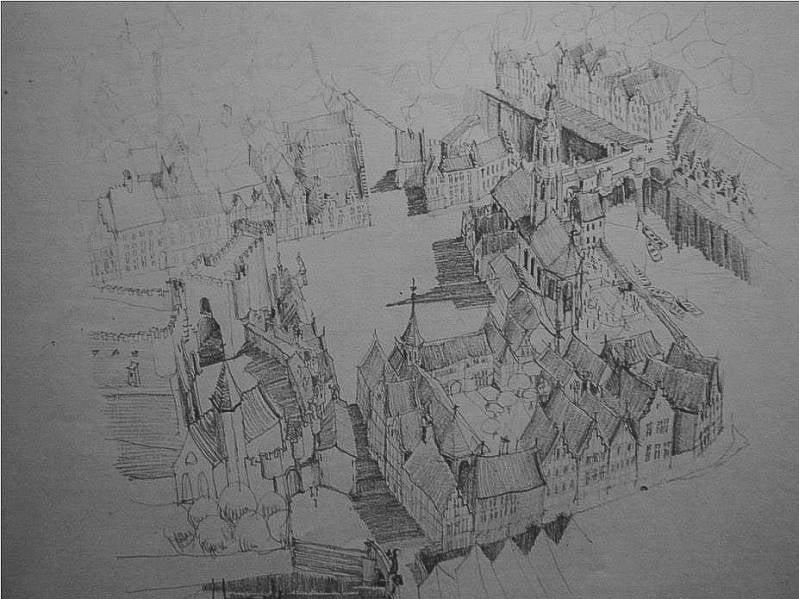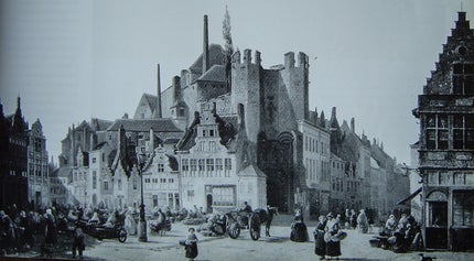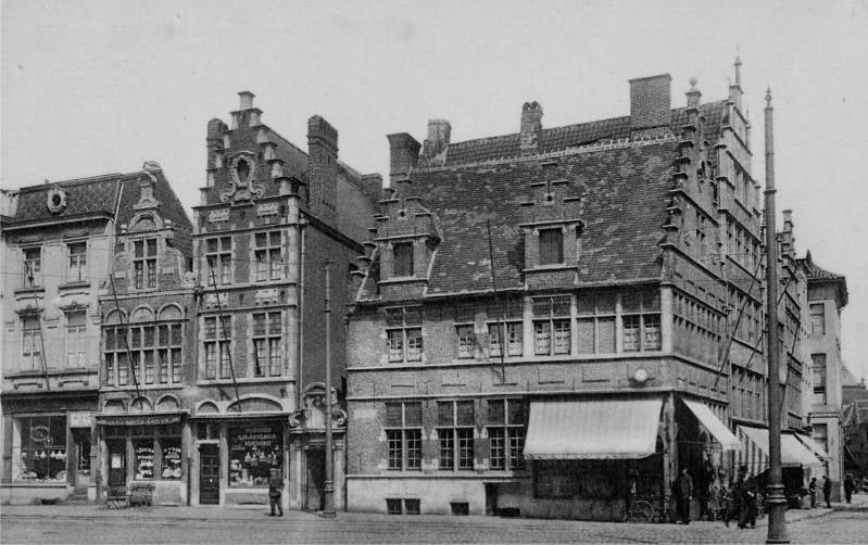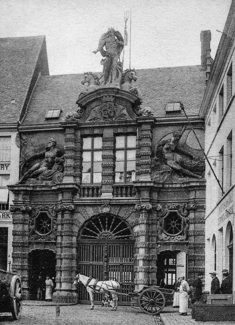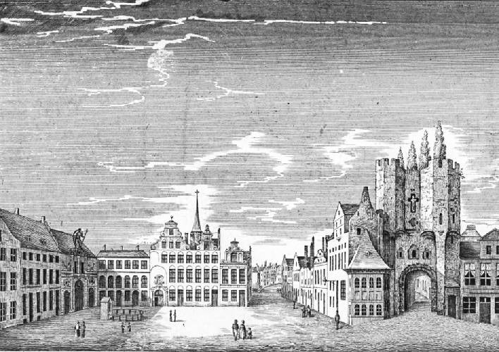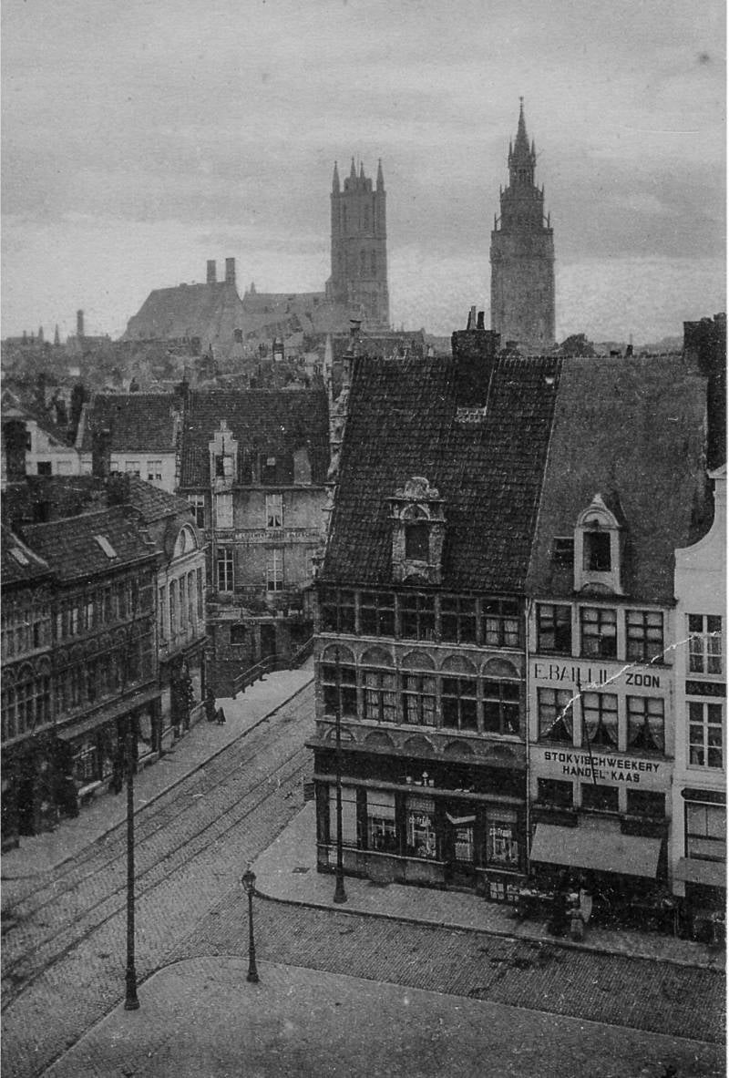 Sire Gheleyn van Maldeghem, die privileges van de Gentenaren had geschonden, moest als straf de vier houten palen, die de nabijgelegen Groentenmarkt afbakenden, vervangen. Ze waren op een achthoekig voetstuk geplaatst en bekroond met een leeuw die een vlag droeg van Gent, Vlaanderen, Bourgondië en Oostenrijk. In 1782 verdwenen ze uit het straatbeeld.