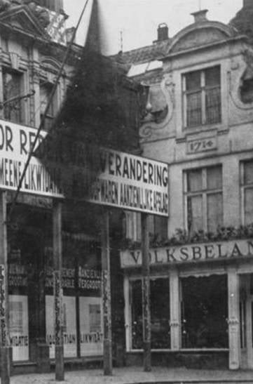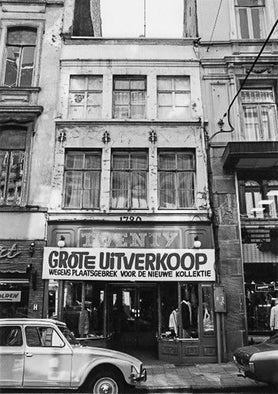 Bijzonder aan deze boekhandel was dat er aan de kant van de Veldstraat twee vitrines waren voor de Franse boeken en aan de kant van de Volderstraat een vitrine voor de Vlaamse boeken.