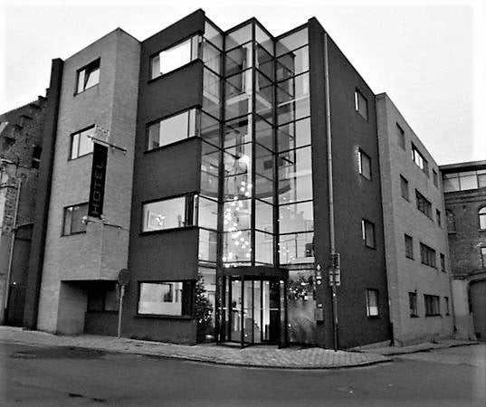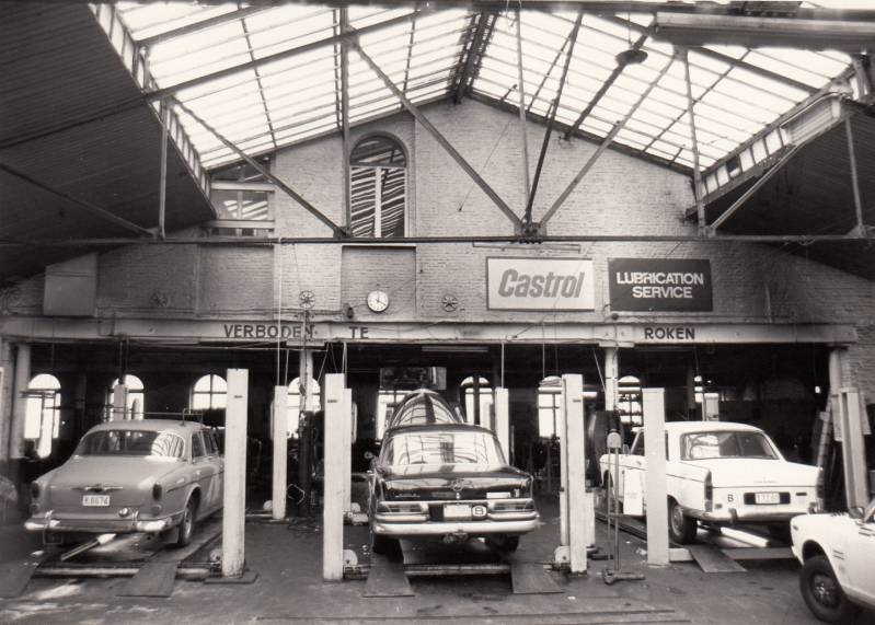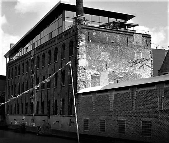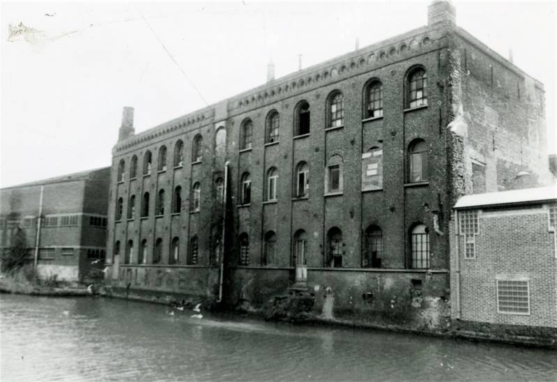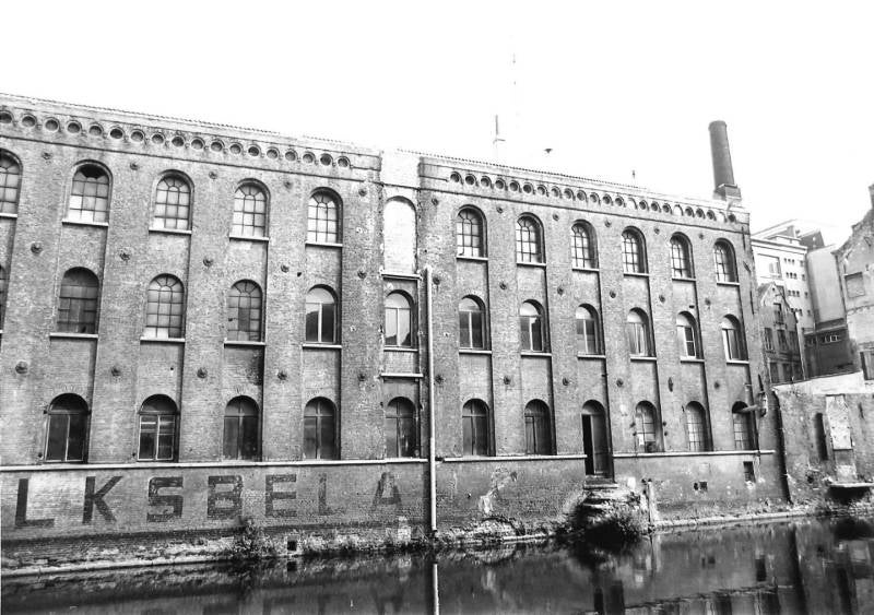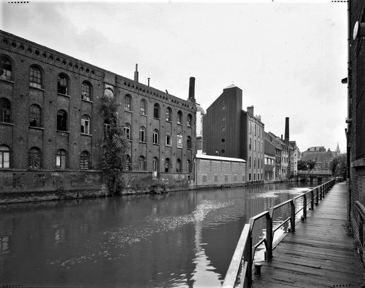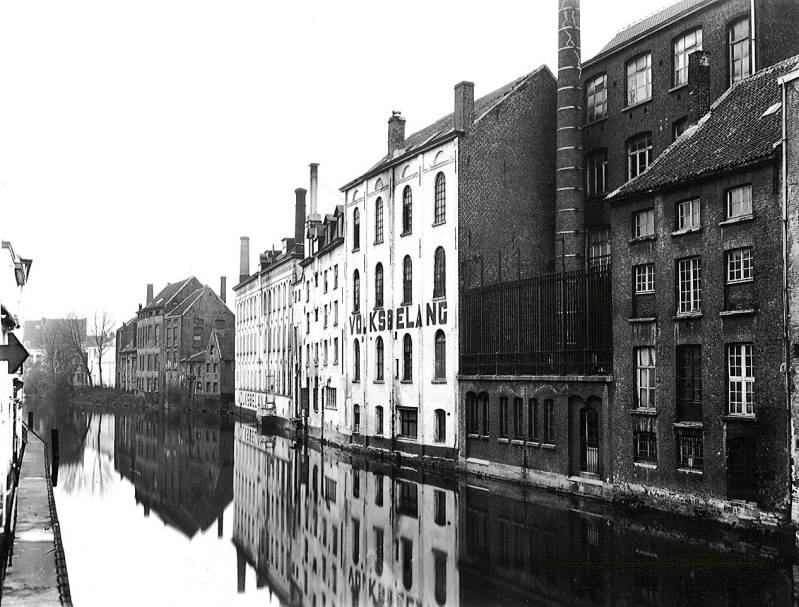 Er bevindt zich een industriële constructie, in 1857 gebouwd als rijstpelderij, op de grondvesten van een afgebrande suikerraffinaderij. Het werd herhaaldelijk uitgebreid en van functie veranderd: stoomkatoenspinnerij in 1873; magazijn in 1879; in 1892 stoombroodbakkerij van de N.V. "Volksbelang"; deels gesloopt in 1908. Het huidige deel dateert vnl. van 1857.Vroeger stond dit complex in verbinding met de mechanische broodbakkerij van de N.V. "Volksbelang" (cf. infra): getuige daarvan de sporen van afbraak in de N.-O.-gevel.