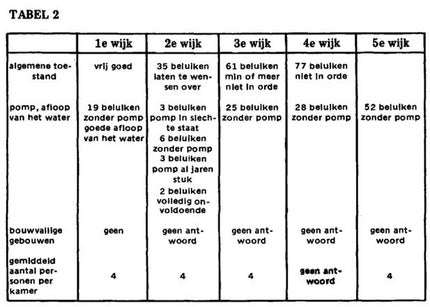 Overigens liet de sanitaire installatie van de beluiken in alle stadswijken te wensen over : 136 beluiken beschikten niet over een pomp (althans niet over een die werkte), 244 beluiken schoten in een of ander opzicht te kort (voor de Ie en 5e wijk telden wij enkel die zonder pomp). Wij moeten bij de interpretatie van deze cijfers natuurlijk rekening houden met het feit dat de commissarissen niet over normen konden beschikken : zij oordeelden op eigen gezag of een beluik al dan niet te wensen overliet. (tabel 2)