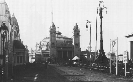 Het paviljoen biedt met zijn grote koepel geflankeerd door twee slanke torens een imposante verschijning. Het is ontworpen door Mr. Caluwaerts.