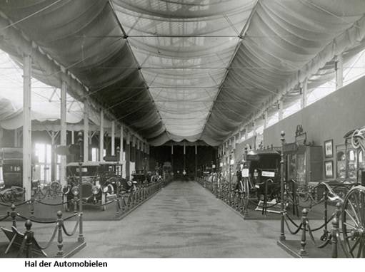 In de Hal der Machines was een afdeling autoindustrie waar de allernieuwste automobielen naast moderne paardenkoetsen stonden opgesteld.