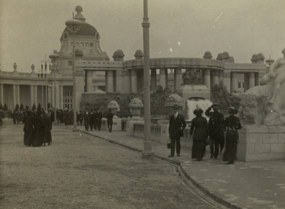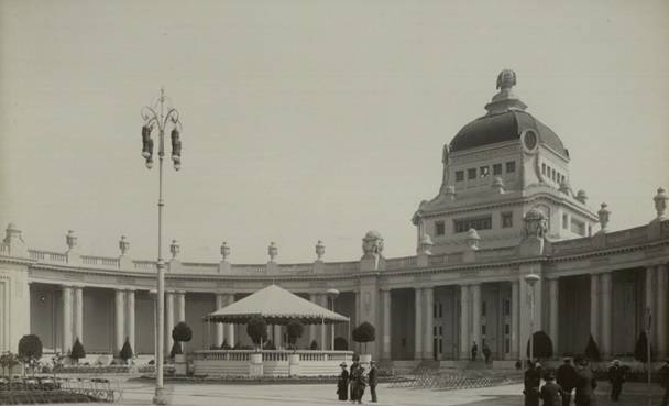 Het Paleis voor Schone Kunsten lag rechtover de hoofdingang aan het eind van het Erehof. De toegang as cirkelvormig met een galerij, die uitgaf op een galerij omgeven door zuielen. Op het toegangsplein stond een kiosk.